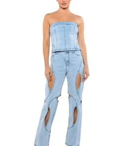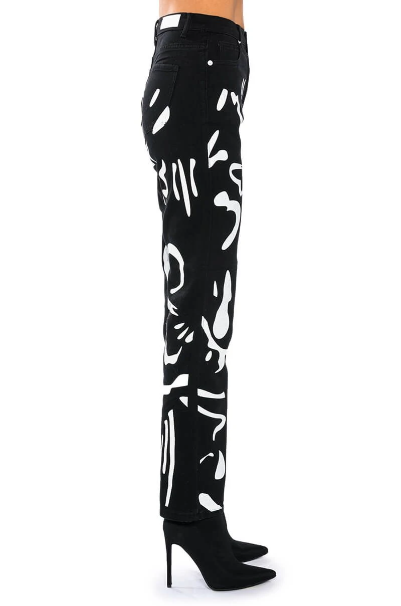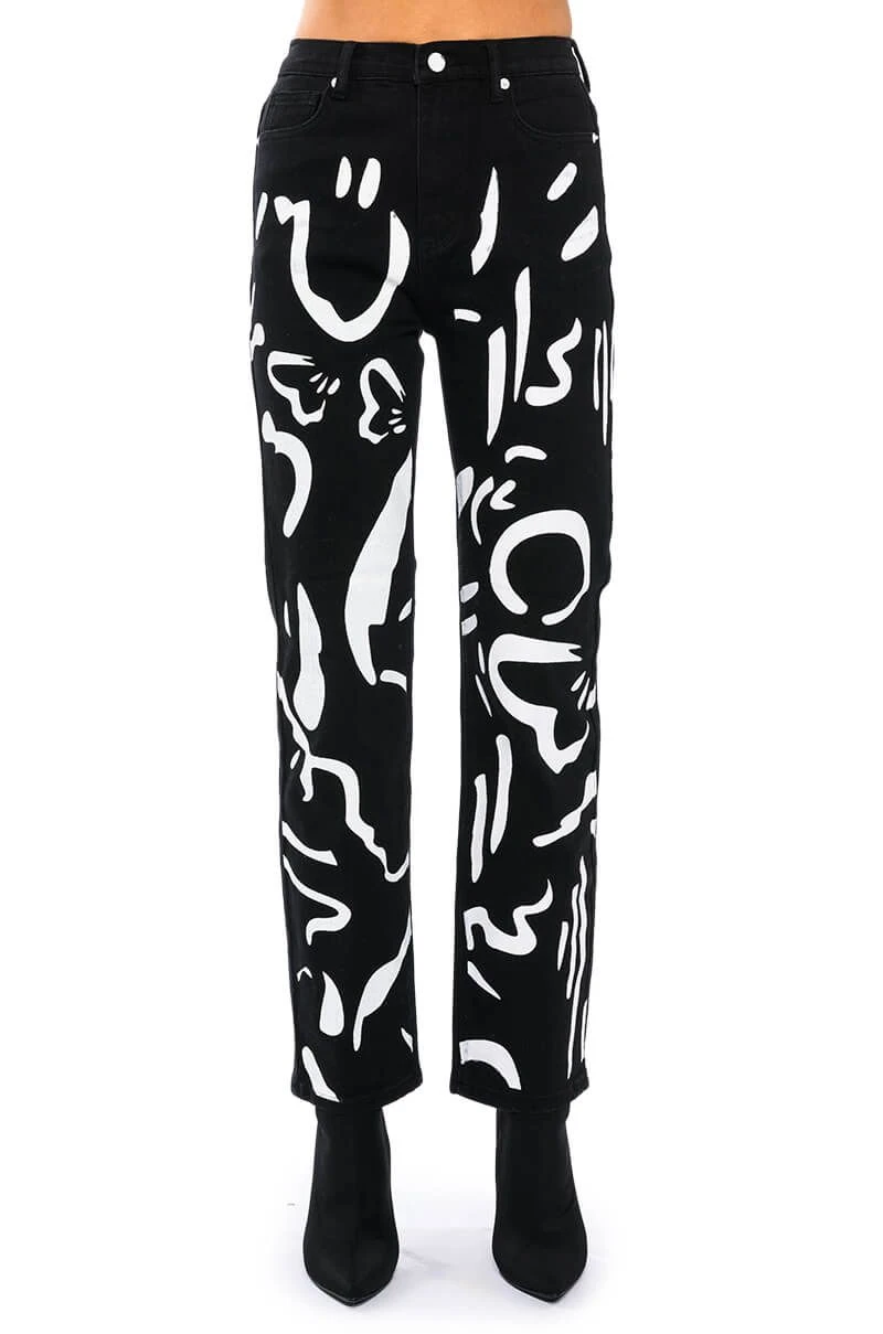 The AKIRA Label Abstract Painted High Waisted Wide Leg Jean features sturdy denim fabrication, graphic painted abstract print patterning, a high rise waist, working belt loops, a classic five-pocket design, a straight leg silhouette, and a front button and zipper closure.