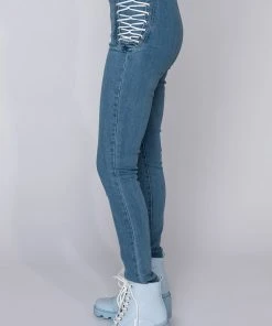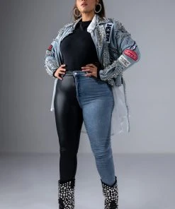 The AKIRA Label Addy Studded Hardware Relaxed Fit Jeans are made from a structured denim fabrication and feature a high rise waist, a four-pocket design, contrast stitching, a relaxed fit silhouette, and a front button and zipper closure. Complete with studded spike detailing along the belt loops and knees.