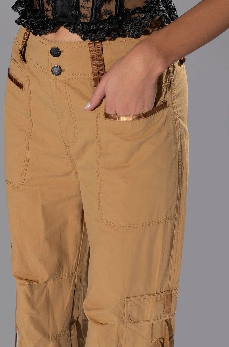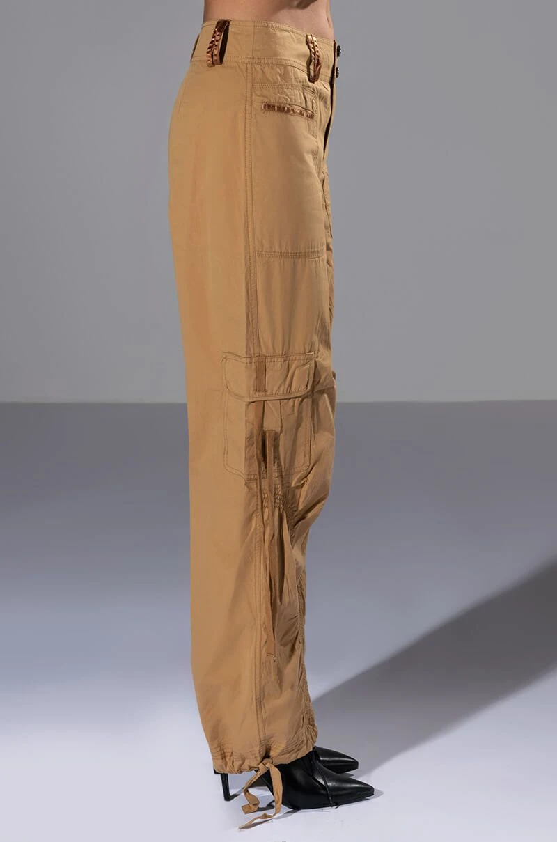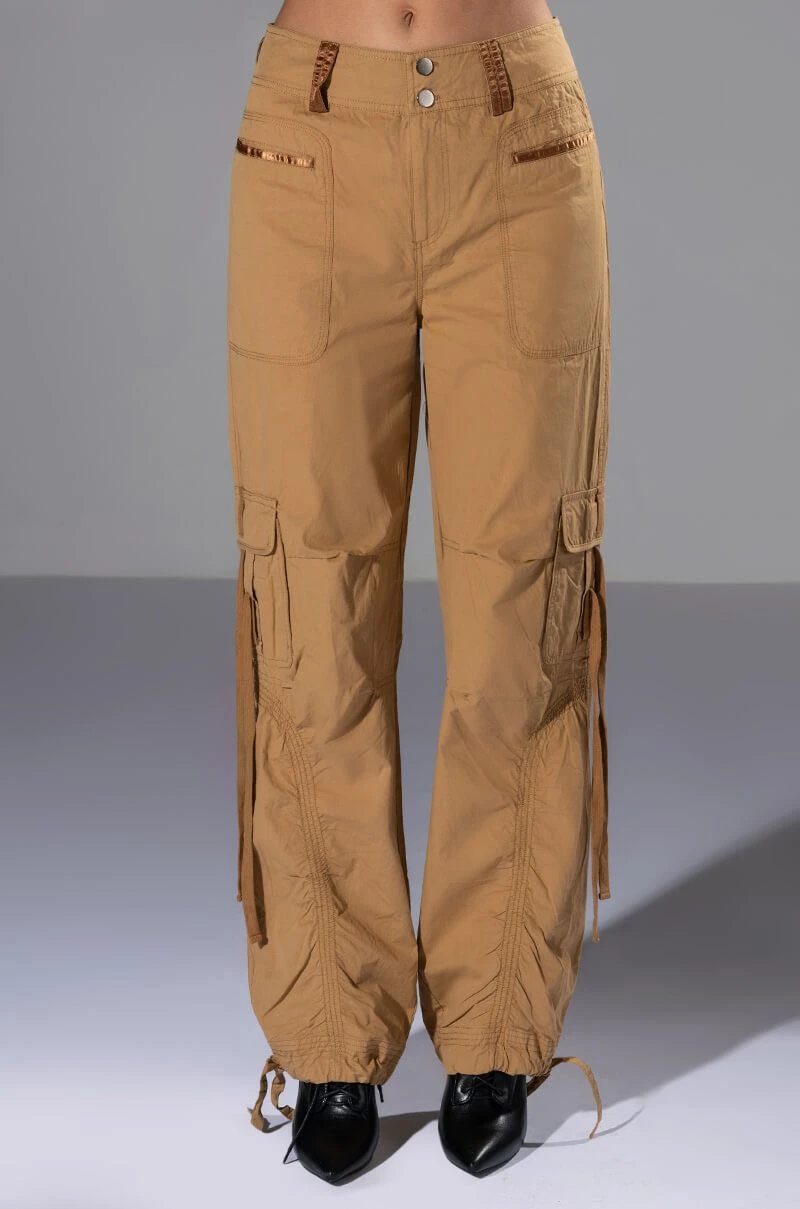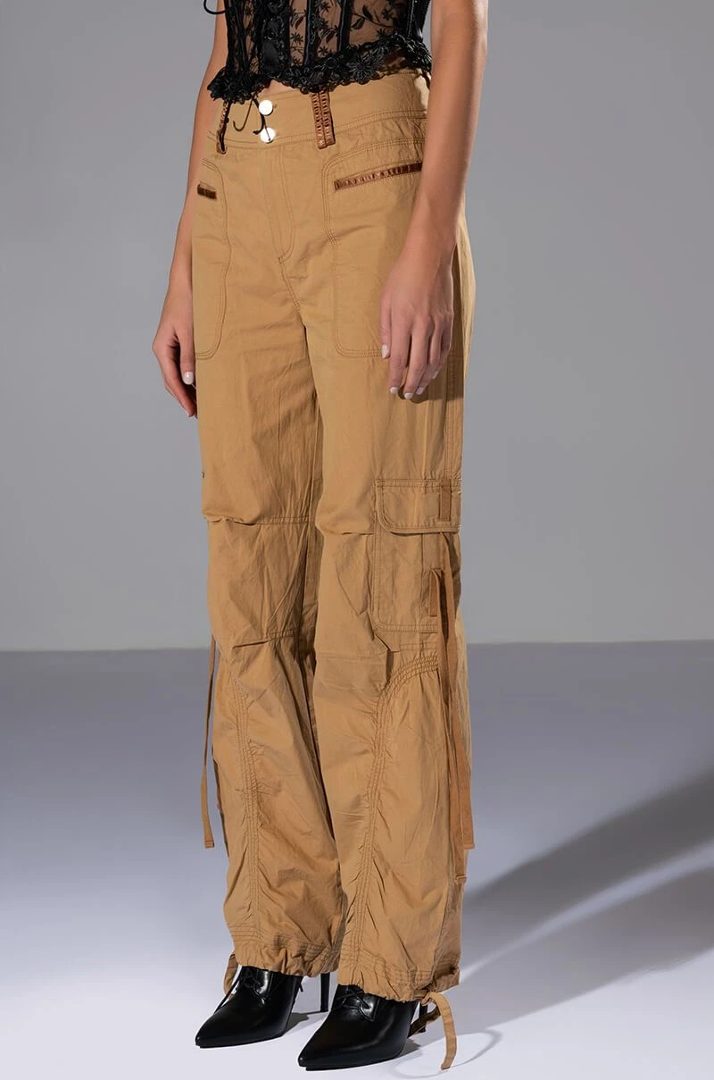 The AKIRA Label All In A Days Work High Rise Cargo Pant is made from a smooth, cotton fabrication and features a high rise waist, working belt loops with satiny detail, and a zip-up to double button front closure. Complete with tie patch pockets at the side, utility seaming, slit front pockets, and drawstrings at the bottom hems for a cinched ankle look. Pair with a bodysuit and heeled booties for an effortless off-duty look!