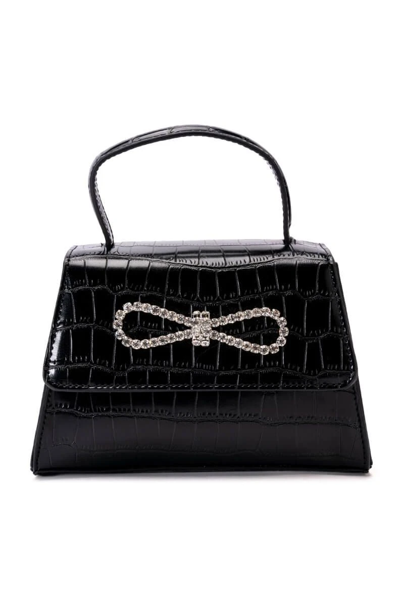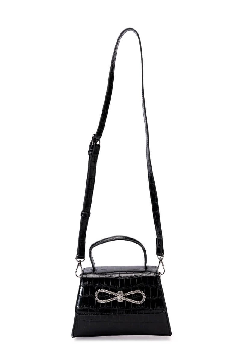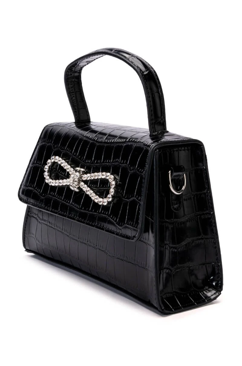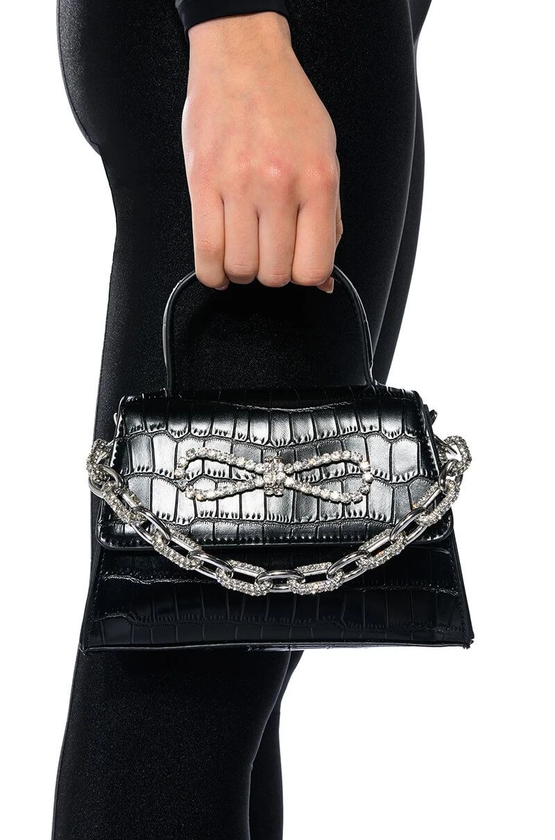 The AKIRA Label All Night Top Handle Croc Embellished Bag is made from a vegan croc leather base and features a boxy silhouette, a coordinating top handle strap, a front rhinestone bow, a detachable, rhinestone-embellished cable chain detail, and a front flap with a magnetic snap button closure. Complete with an included, adjustable vegan croc leather shoulder strap.