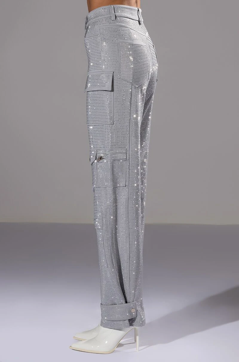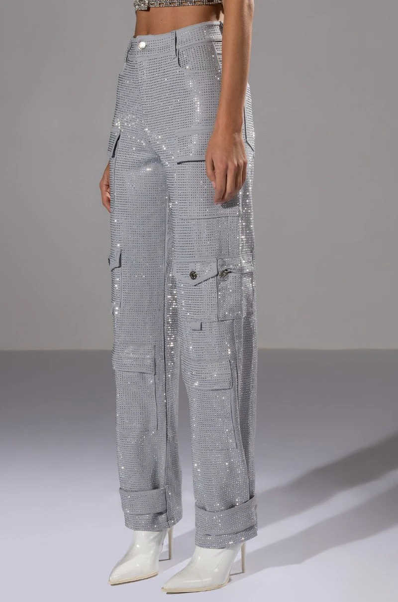 The AMMO Bonne Soiree Rhinestone Cargo Pants are made from a stretchy, cargo pant fabrication and features an all over rhinestone studded design, high rise waist, and classic zip-up button front closure. Complete with patch pockets, zipper cargo pockets, working back pockets, and a straight leg silhouette with adjustable snap closure at the hems. Pair with your fave cropped tee and booties for your effortless soiree look!