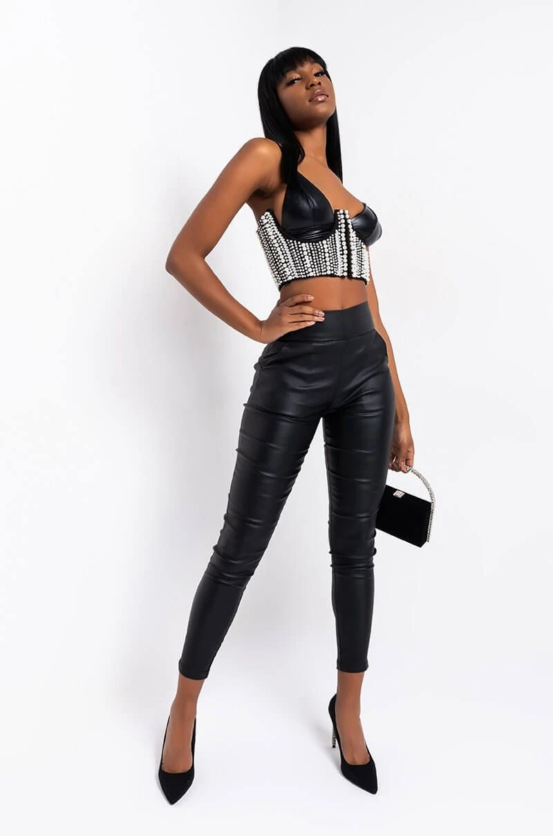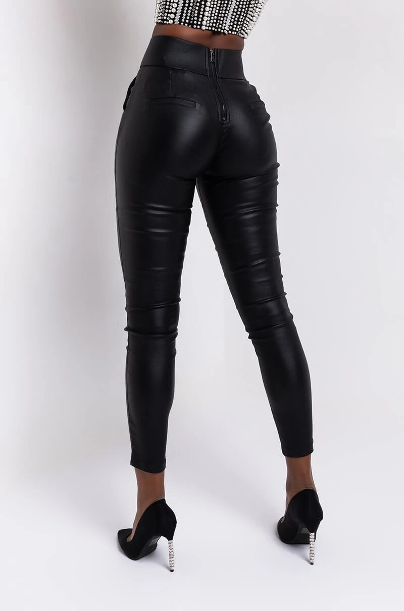 The AMMO X AKIRA Big Booty High Waist Pleather Pant With 4 Way Stretch is essential for fall with its high rise waist, slim leg fit, functional side pockets, metallic back zipper closure, and smooth faux leather construction. Style with a crisp button up and heeled ankle booties for an executive look.