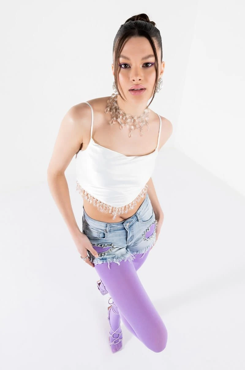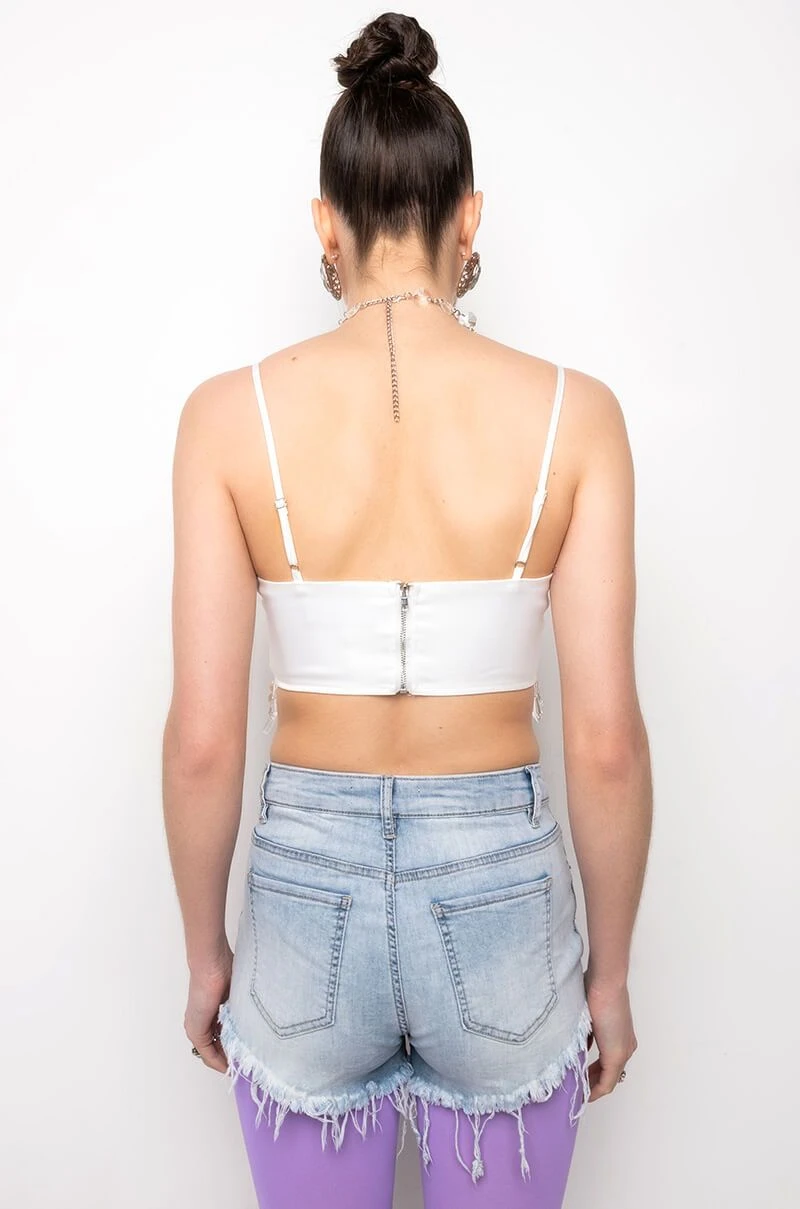 Live on Cloud 9 in The AKIRA Label Angel Babe Beaded Trim Cowl Neck Tank. This luxe satin piece features adjustable tank straps, scowl neckline, point hemline, beaded trim, and an ultra cropped cut. Pair this top with leather look leggings and lace up stiletto sandals for an angelic ensemble