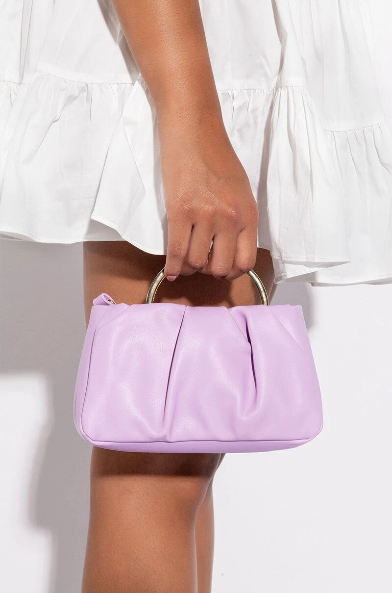 Fuel your shopping addiction with The AKIRA Label Bad Habits Lilac Purse. This supple vegan leather mini bag features a pleated baguette silhouette, a metallic top handle, and dual magnetic inner clasp closures. Complete with an adjustable, detachable vegan leather shoulder strap.
