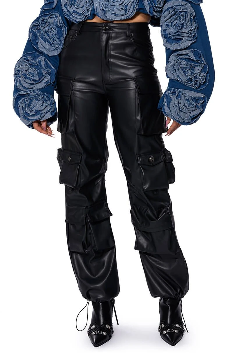 Strike a pose! The AKIRA Label Basically A Model PU Cargo Pant is made from a pebbled faux leather fabrication and features a high rise waist, belt loops, a classic five-pocket design, cargo flap and button flap pockets along the legs, a straight leg silhouette, toggle drawstring ankle hems, and a button and zipper front closure.