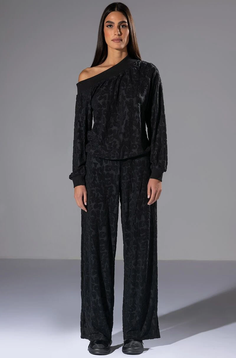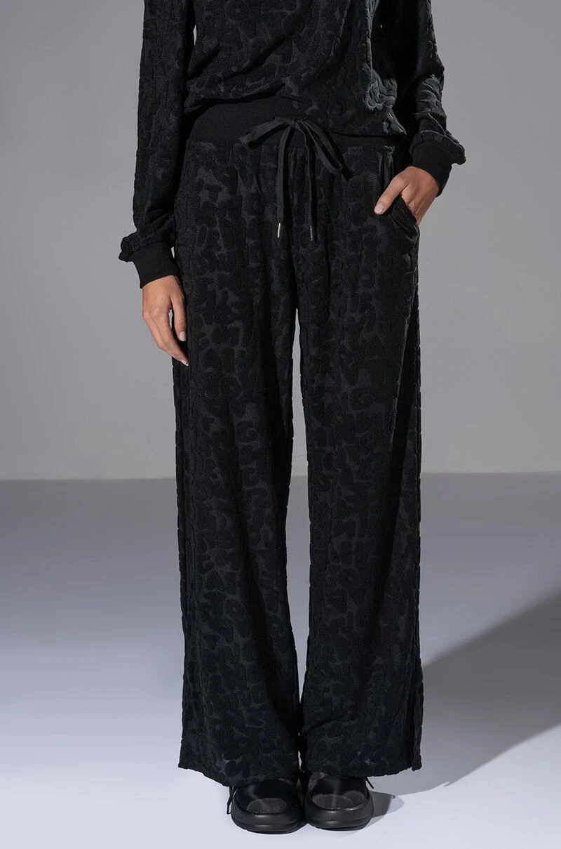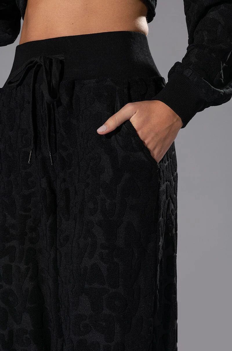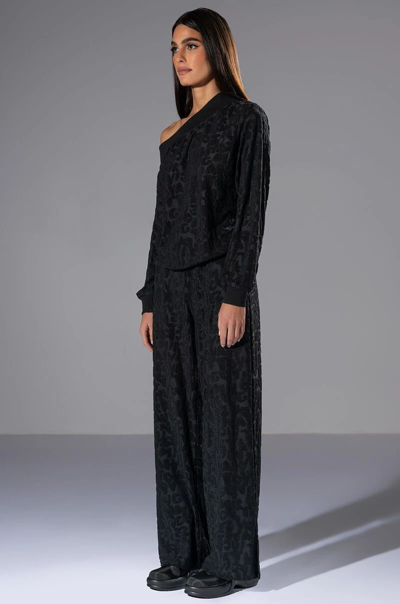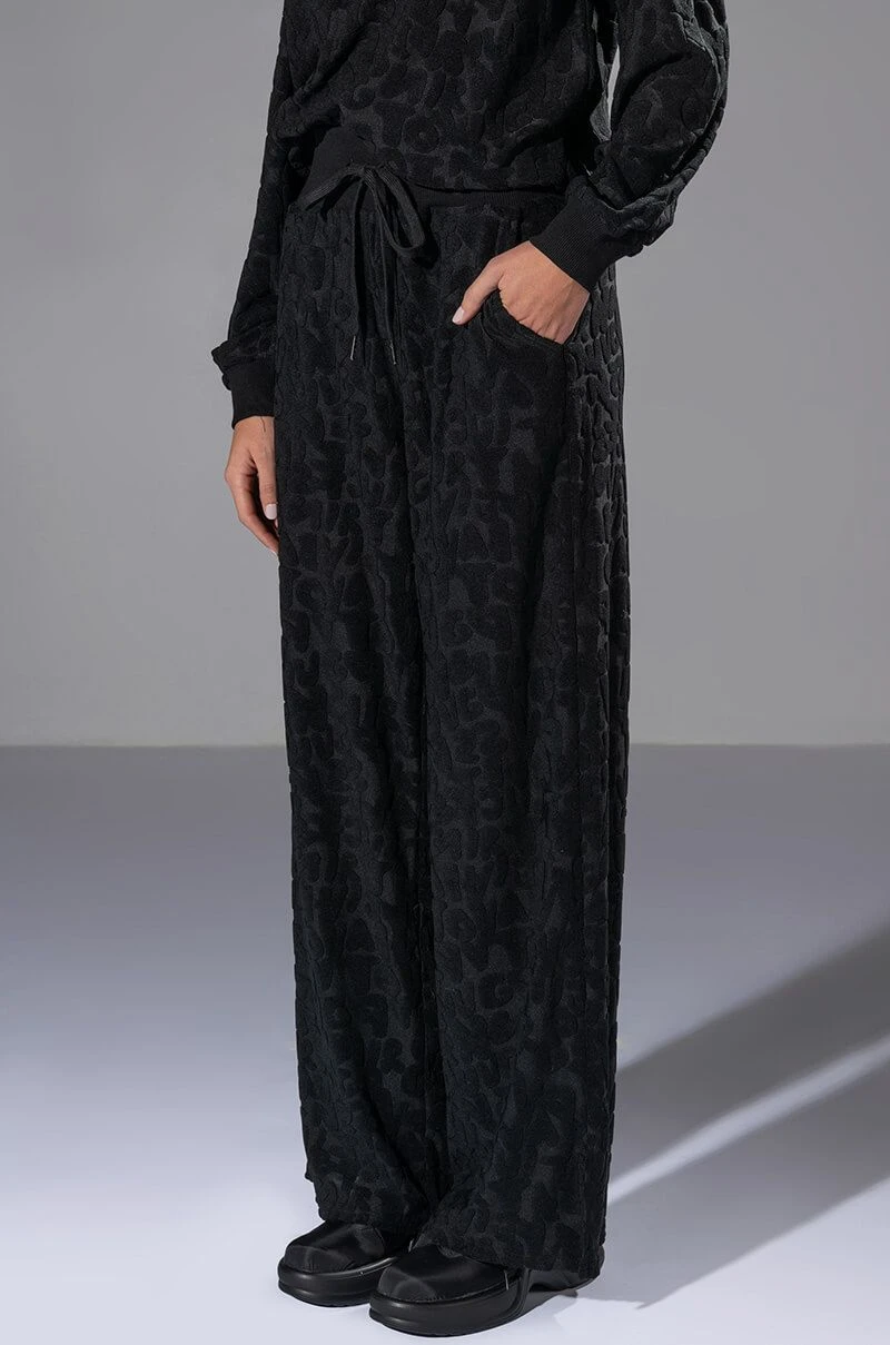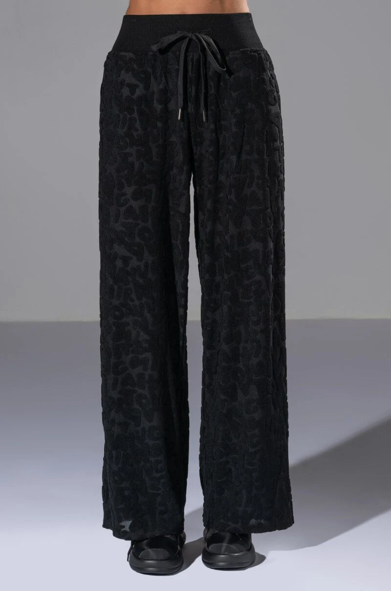 The AKIRA Label Be Here Textured Wide Leg Sweatpant is made from a cozy sweatpant fabrication and features terry-embossed clustered letter detailing, a high rise waist, a wide ribbed elastic drawstring waistband, slant side pockets, and a wide leg silhouette. Pair this piece with the matching AKIRA Label Be Here Textured Off Shoulder Sweatshirt to complete your look.