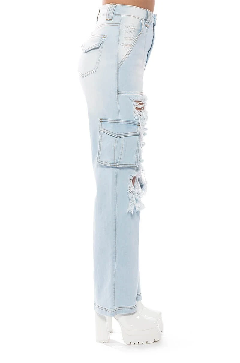The AKIRA Label Be Real Distressed Cargo High Rise Jeans feature a stretch denim fabrication, a high rise waist, functional belt loops, side pockets, and cargo flap pockets at the thighs and rear. Complete with a straight leg silhouette, distressed front detailing, and a button and zipper front closure.