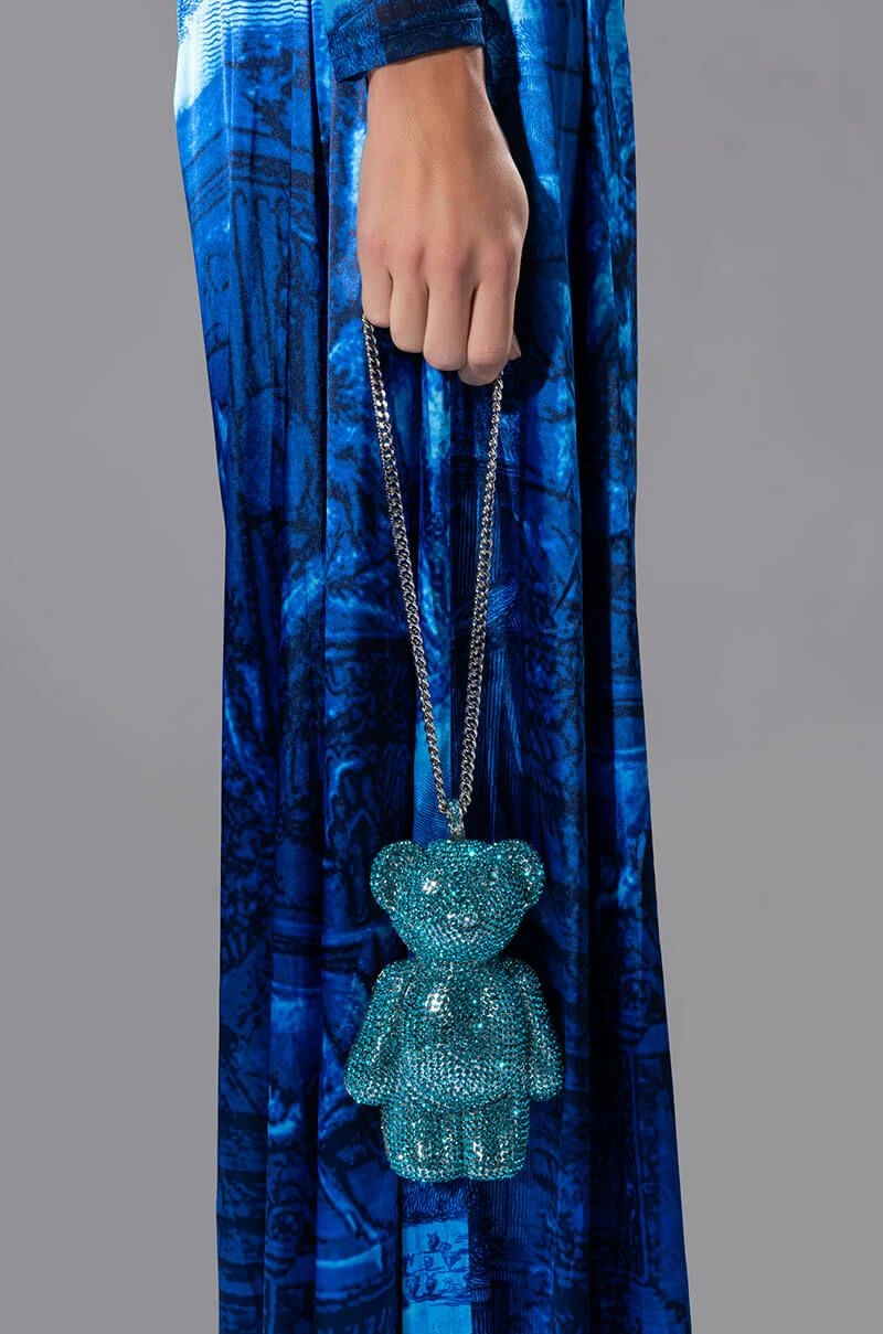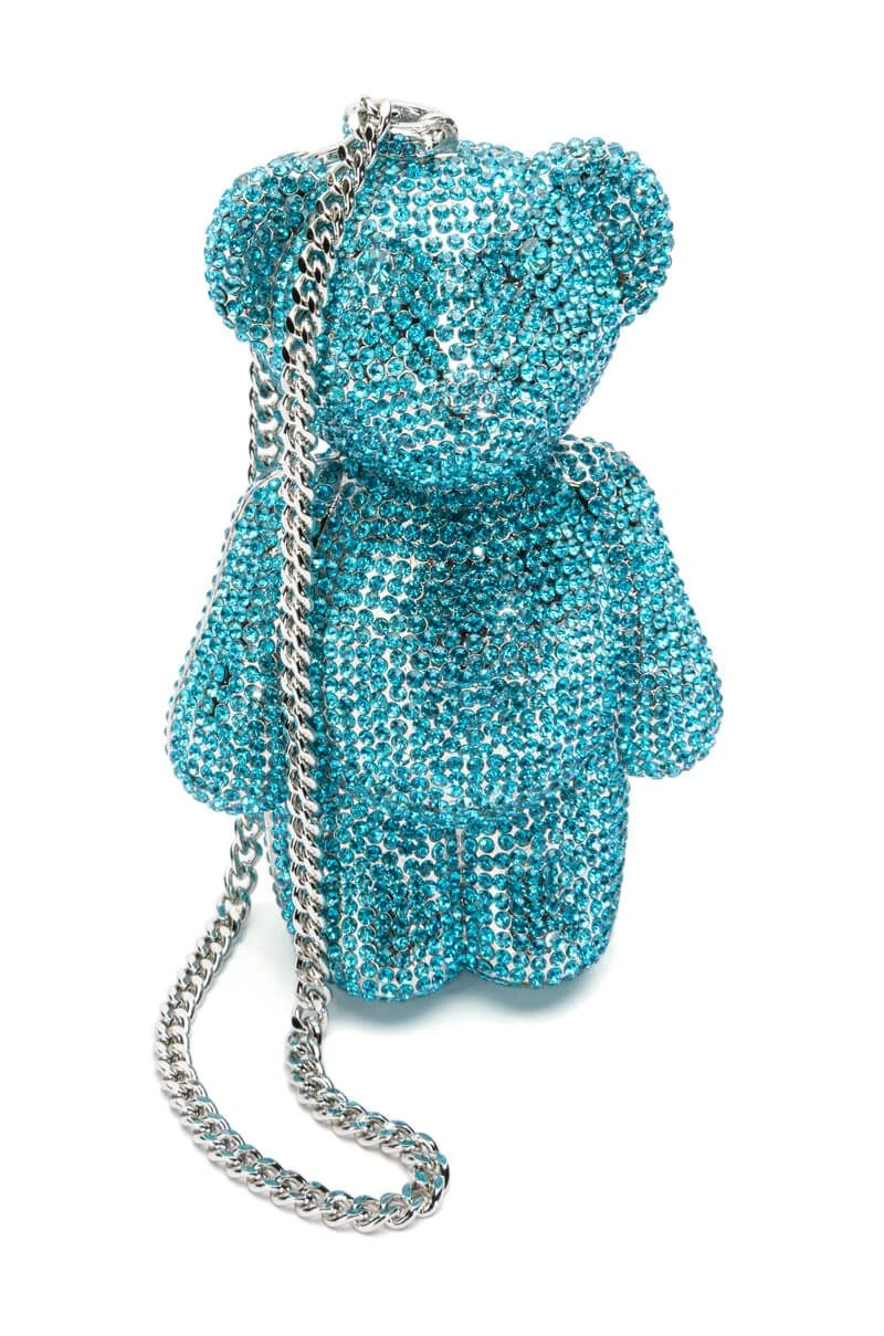 The AKIRA Label Bearry Cute Rhinestone Clutch is an ultra glam rhinestone-embellished handbag shaped like a teddy bear. Complete with a push lock magnetic closure, a metallic silver faux leather lining, and two individual, removable chain straps with lobster claw closure detail.