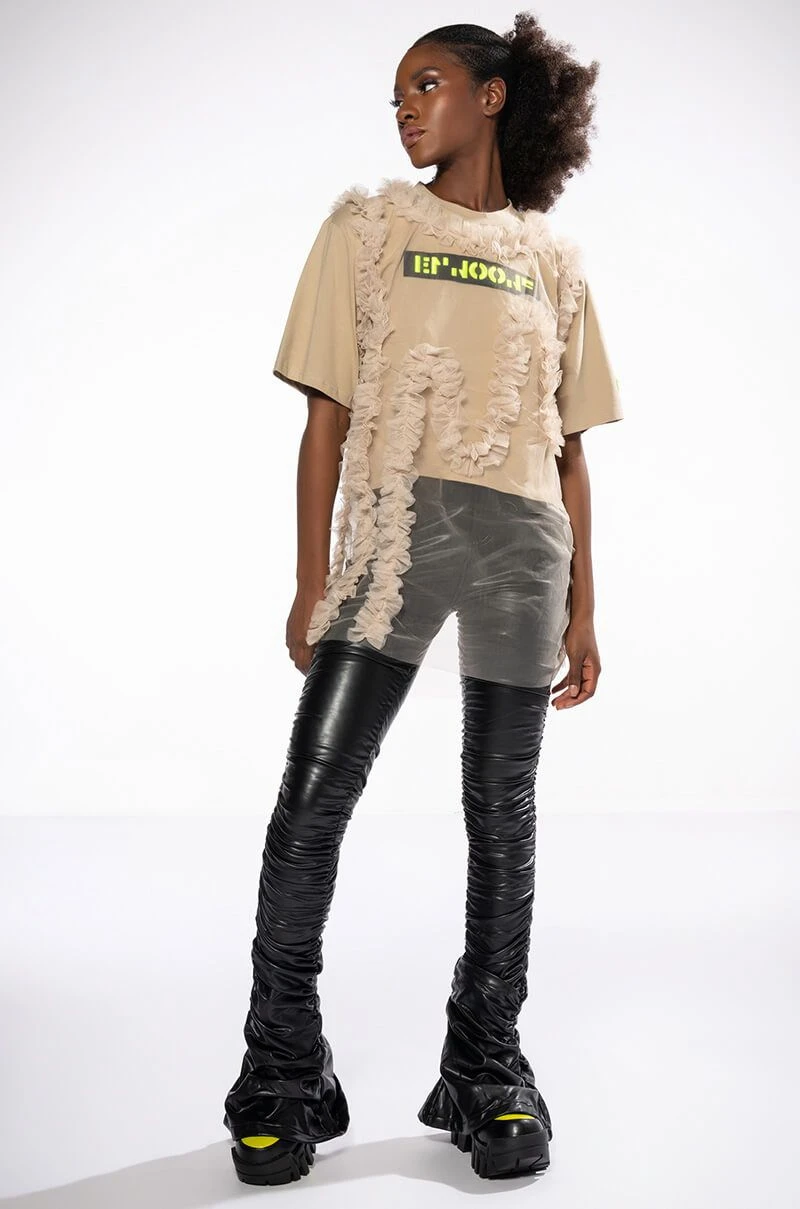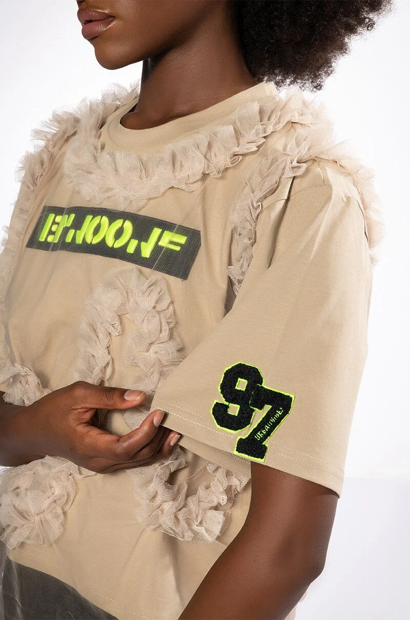 The AKIRA Label Beige Ruffle Tshirt is a classic cotton t shirt complete with a cropped cut, a crew neckline, short sleeves, and a longline tulle overlay. Complete with ruffle trim detailing and embroidered abstract text front patch accents.