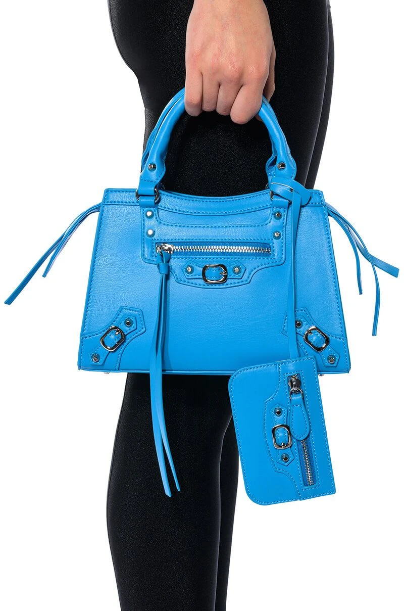 The AKIRA Label Bernadetta Strappy Blue Bag features a vegan leather base, a top handle purse silhouette, a double fringed zipper closure, and a chic, removable shoulder strap with grommet detailing. Complete with a mini front zip pocket, moto-inspired silver buckle hardware, an inner zippered pocket, and a detachable card-holder wallet. This versatile piece goes with your entire wardrobe, TBH!