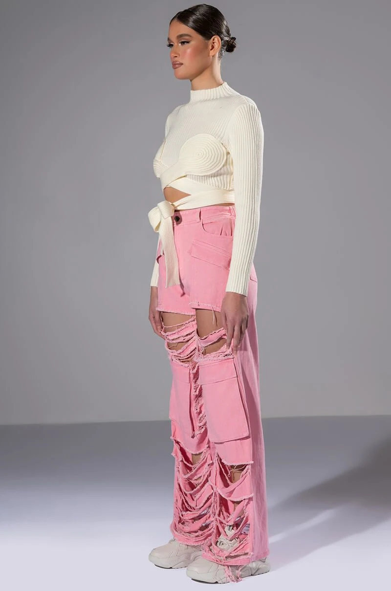 Sisterhood of the traveling cargos. The AKIRA Label Besties Favorite Distressed Cargo Pants are a vibrant take on cargo denim featuring a high rise waist, slant side pockets, dual flap front cargo pockets, a wide leg silhouette, and ultra-distressed detailing along the thighs and shins. Complete with a zip button front closure and a cinched elastic back waistband. Pair this piece with a button down and loafers to finish off your amped-up casual look.