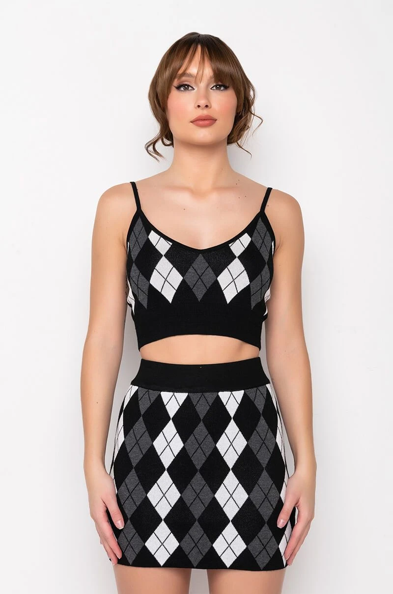 The AKIRA Label Birdie Argyle Knit Crop Top features a stretchy knit fabrication, an allover argyle print, slim spaghetti straps, a v neckline, a ribbed knit hem, and a slip on fit. Complete the look with The AKIRA Label Birdie Argyle Cropped Cardigan and Knit Mini Skirt for a cozy schoolgirl look!