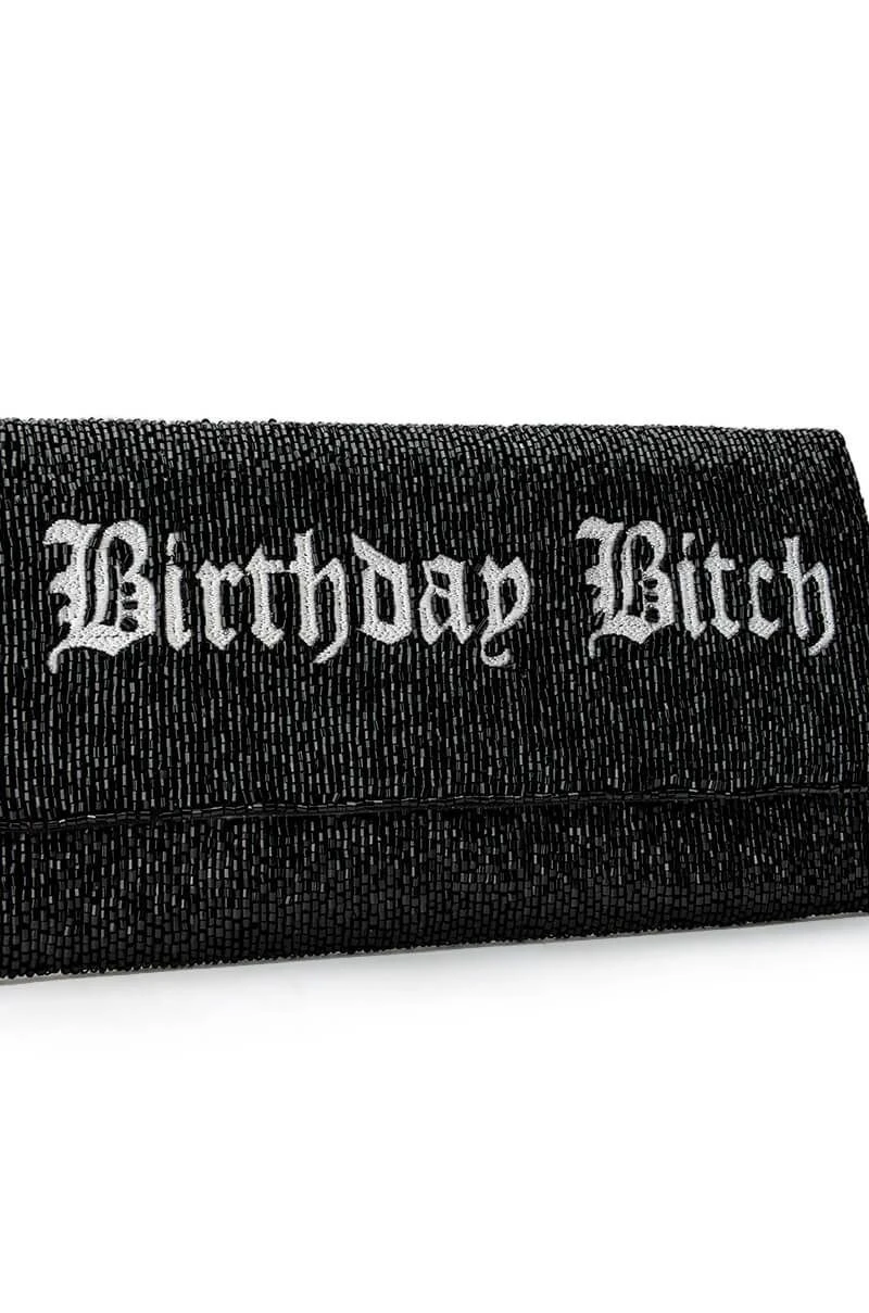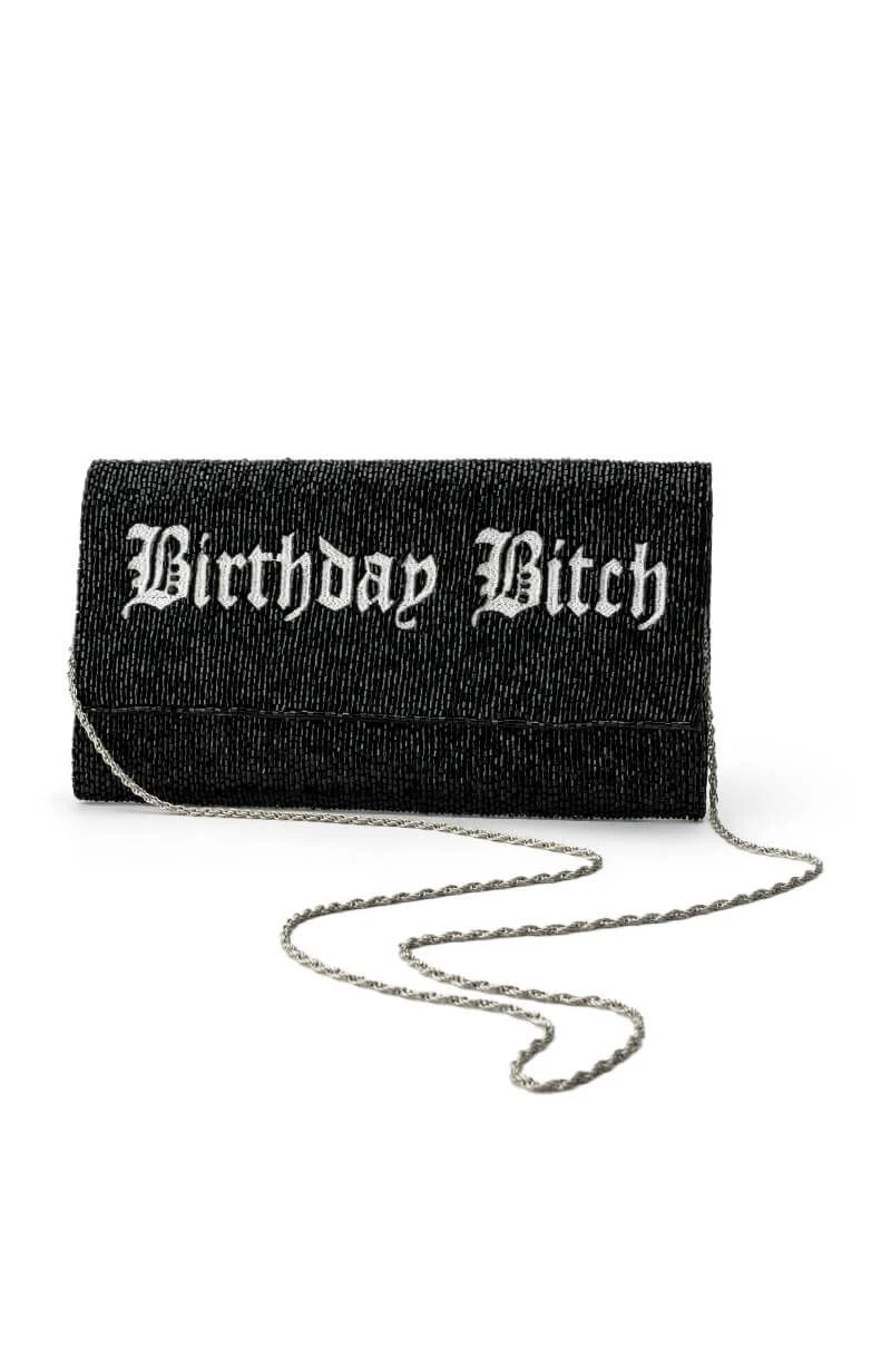 Celebrate your day with a bang with The AKIRA Label Birthday Bitch Beaded Clutch! This slim, beaded clutch features a foldover front with a gothic script “Birthday Bitch”, beaded trim text detail. Complete with a detachable silver braided chain shoulder strap, inner pocket, and magnetic inner closures.