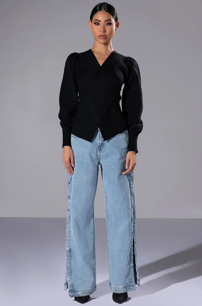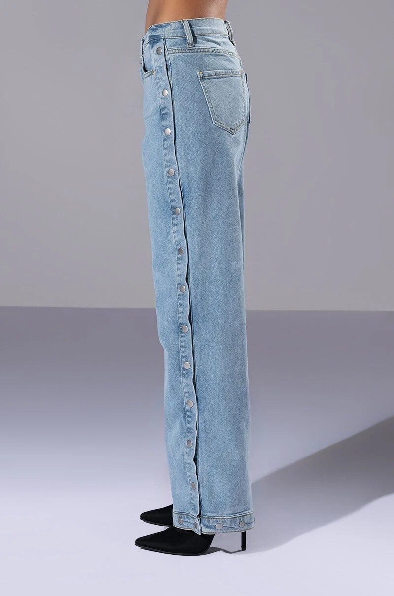 Stressed but blessed in The AKIRA Label Blessed Mess Side Snap High Rise Jeans! These high-waisted bottoms are made from a denim fabrication and feature working belt loops, front and back pockets, and a wide leg silhouette. Complete with snap buttons along the sides and bottom hems, and a classic zip button closure. Pair these pants with a cropped tee, fur-lined moto jacket, and heeled boots for an effortless luxe look!