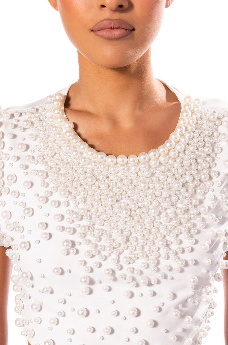 Bring the bling with The AKIRA Label Bling It On Embellished T Shirt. This stretch knit top features a rounded crew neckline, short cap sleeves, and an ultra-cropped cut. Complete with pearl beaded detailing throughout the front and sleeves. Pair with cargo pants and combat boots for a touch of feminine flair.