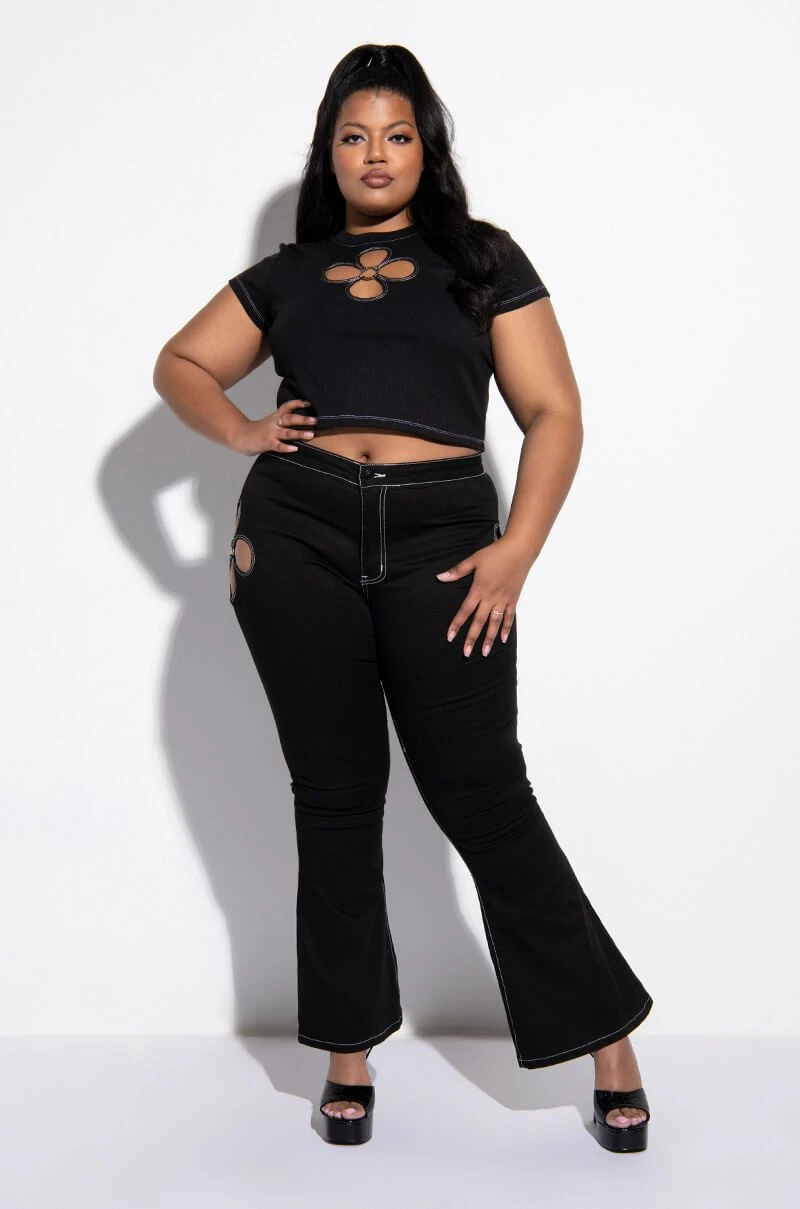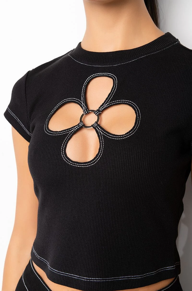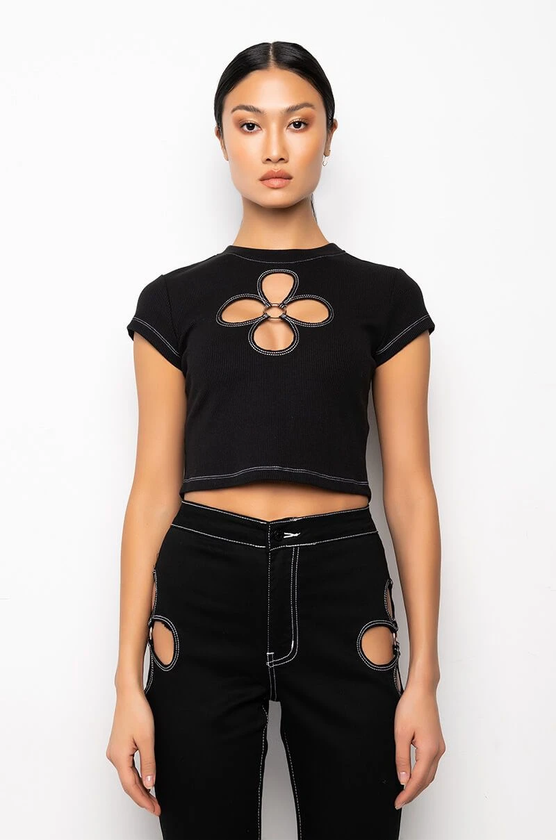 Bloom like the flower you are in The AKIRA Label Blossom Cut Out Short Sleeve Tee Shirt. This piece features a classic crew neckline, a slightly cropped cut, contrast stitch detailing, short sleeves, and flower-like cut outs with silver metallic o-ring detailing at the front and back. This stretchy tee will look extra fabulous with the coordinating AKIRA Label Blossom Cut Out Detail Flare Jean.