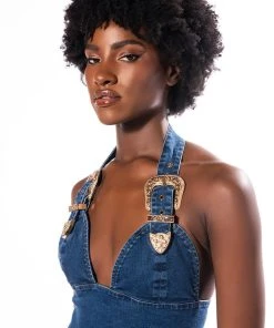 The AKIRA Label Blue Jean Baby Buckle Halter Crop Top is made from a soft stretch denim fabrication and features a halter silhouette with ornate metal belt and buckle details, rounded cups, a plunging neckline, a thick waistband, cropped length, open back, and an exposed back zipper closure with ring. Pair this piece with the coordinating AKIRA Label Blue Jean Baby Buckle Short and Western boots for a fierce denim look!