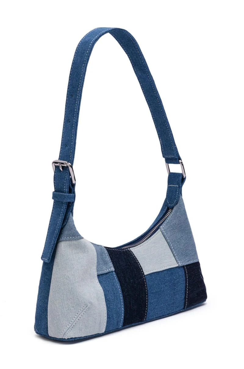 We’re denim dreaming of The AKIRA Label Blue Jean Baby Hand Bag. This mini shoulder bag features a patchwork denim fabrication base, a single adjustable shoulder strap with buckle detailing, a top zip closure, and silver metallic hardware.