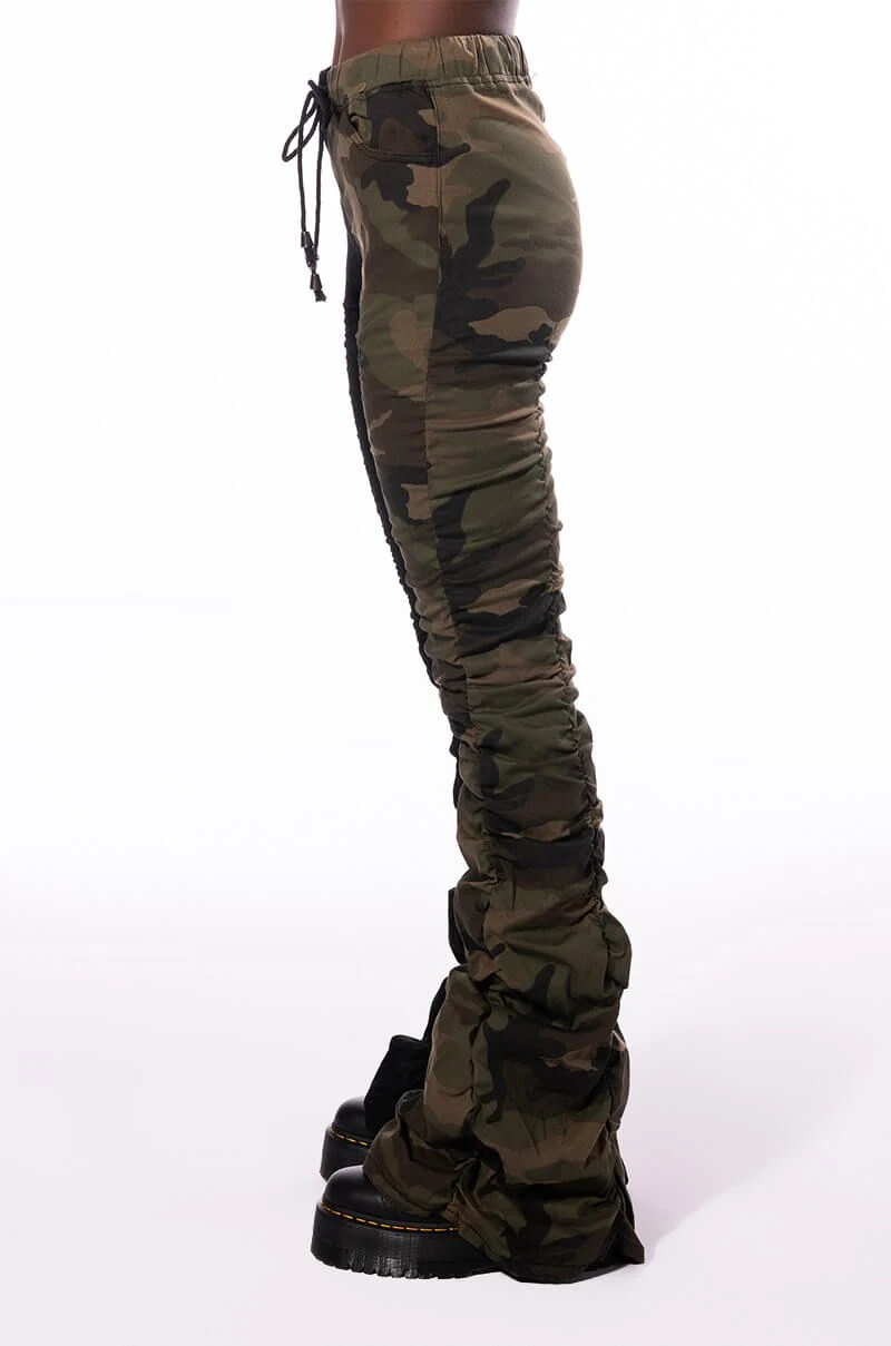 Legs and hips and… Serve body ody ody in The Body Is The Best Cinchec Camo Jogger. These stretch cotton jogger pants featuring an elasticated waistband, a drawstring waist tie, on-seam side pockets, and ruched detailing throughout. Complete with wide bell hems, a two-tone colorway, and camo print patterning. Style with ribbed knit tops or a cropped hoodie for a casual chic look.