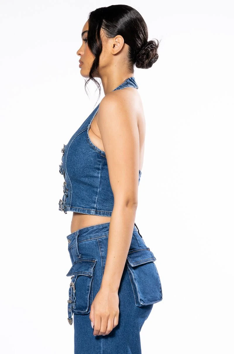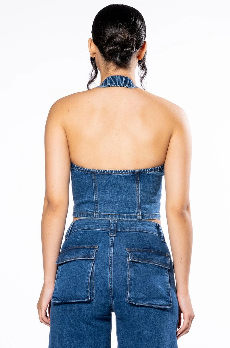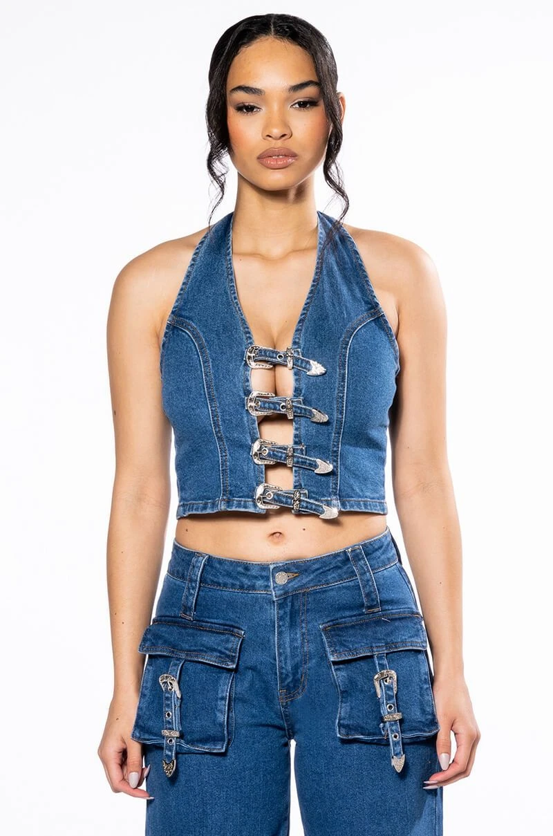 The Akira Label Calypso Denim Halter Neck Top is made from a stretch denim fabrication and features a halter neck silhouette, a cropped cut, and an exposed open back. Complete with a stunning western-style buckle front closure. Pair this piece with the coordinating AKIRA Label Calypso Mid Rise Wide Leg Jeans.