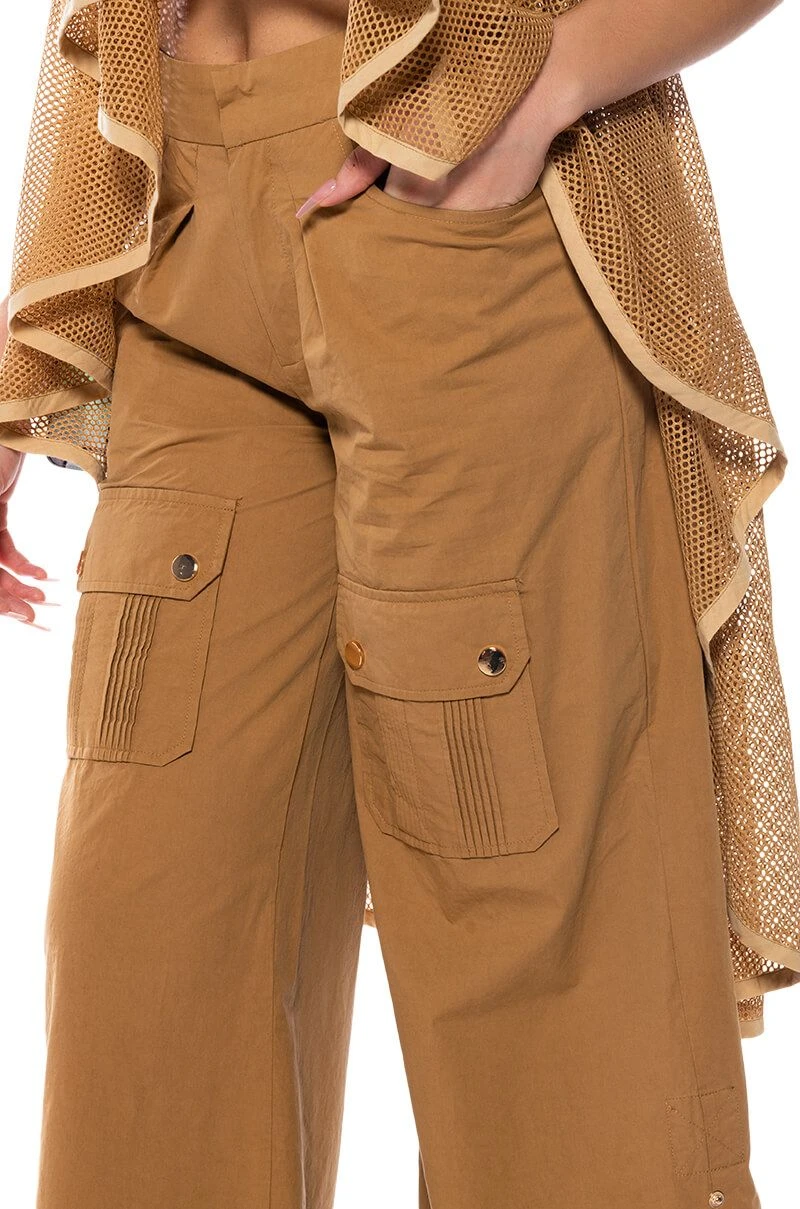 New is in. The AKIRA Label Cargo Chic Wide Leg Pants are part of a utility chic two-piece set made from a smooth, cotton base fabrication and featuring a unique cargo-inspired design, classic zip-up hook-and-eye waist closure, high waist silhouette, side pockets, and elastic ruching at the back for a comfortable fit. Complete with a wide leg, snap buttoned cargo flap pockets at the front, adjustable snap buttoned bottom hems, and a slip-on fit. Style these bottoms with the matching cargo top, The AKIRA Label Mesh Symmetrical High Low Sleeveless Blouse, and chunky boots for a finished look.