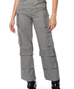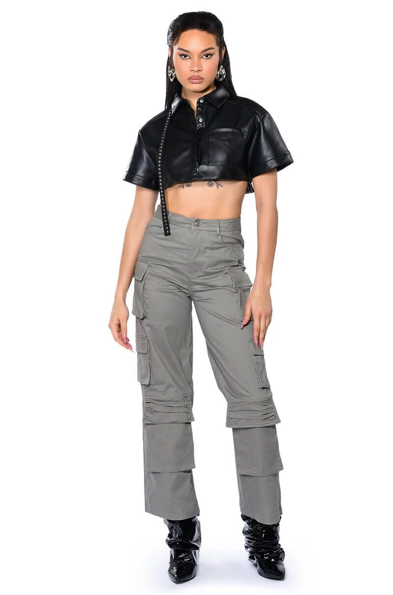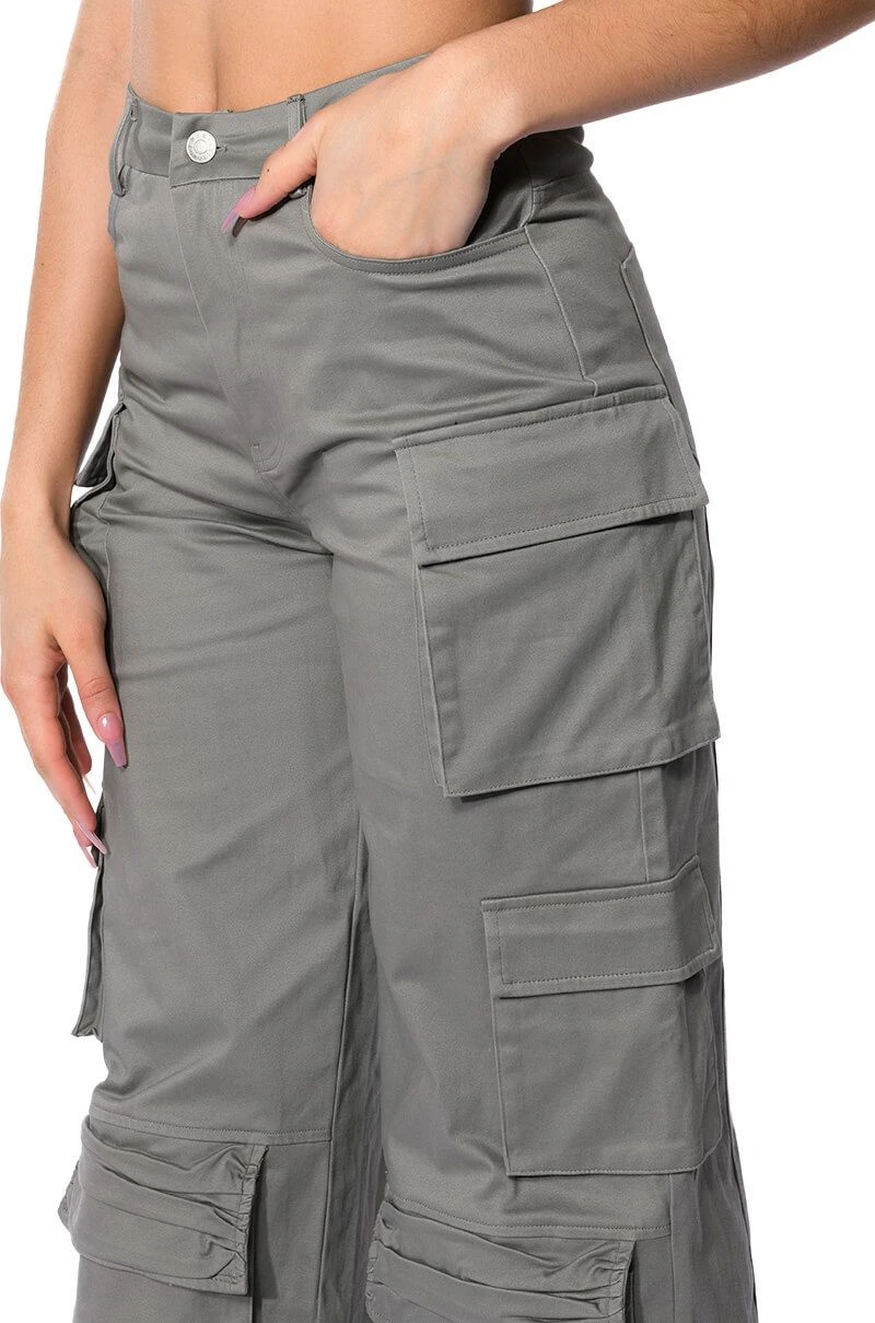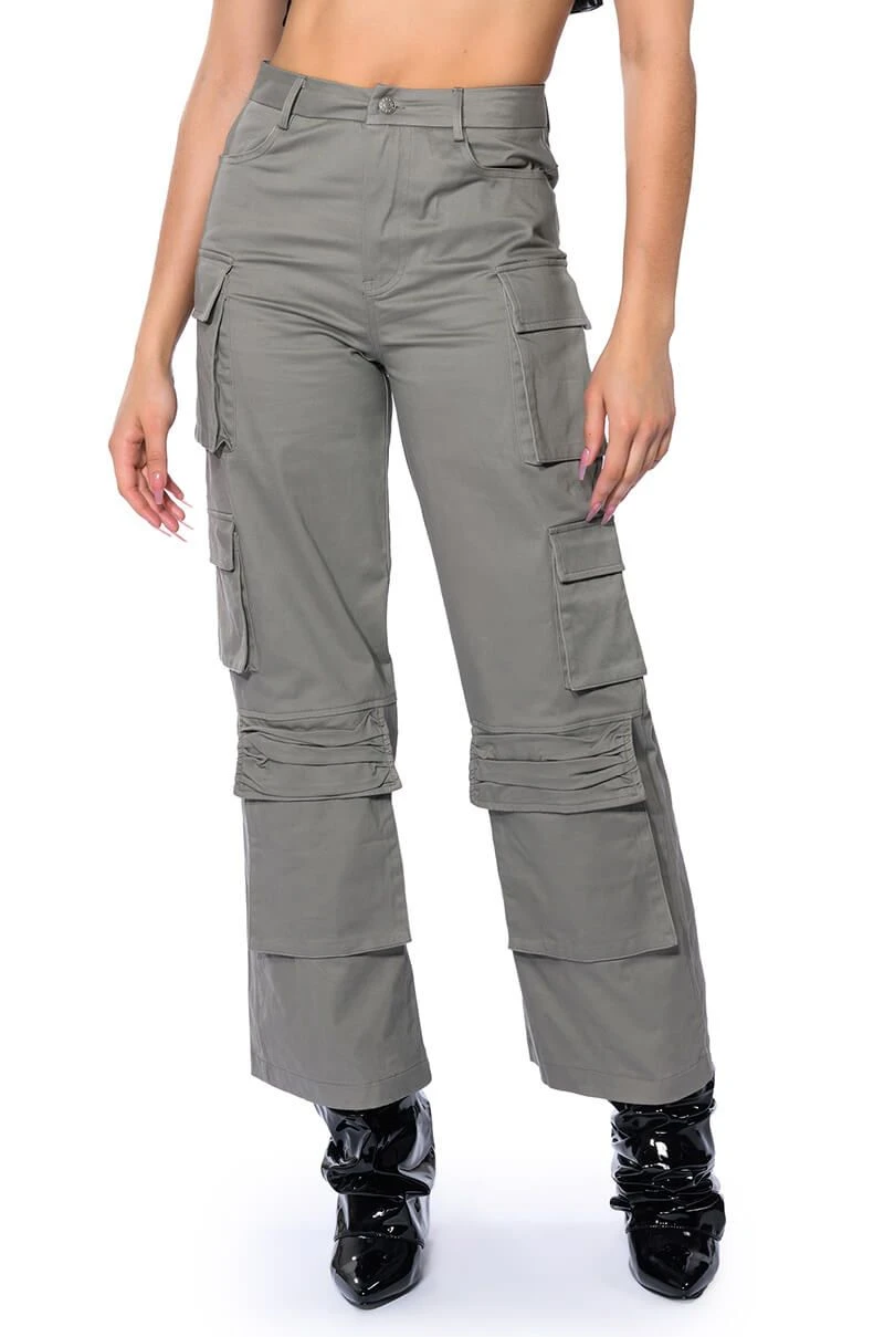 Take charge with The AKIRA Label Champion Of Everything Cargo Pants! These bottoms are made from a thick, structured cotton base fabrication and feature a high waist, a classic zip-up buttoned front closure, side pockets, and a wide leg silhouette. Complete with cargo flap pockets on the sides and utility seaming. Style with a long sleeved bodysuit and platform boots for an easy everyday look.