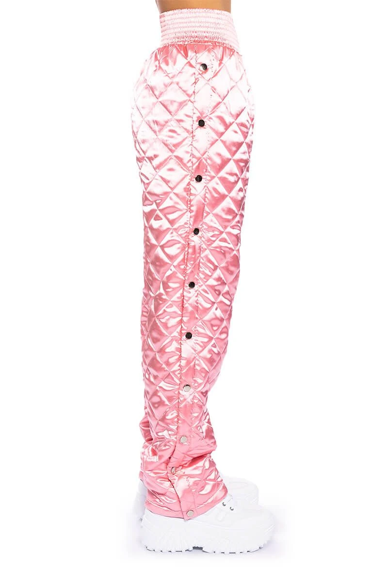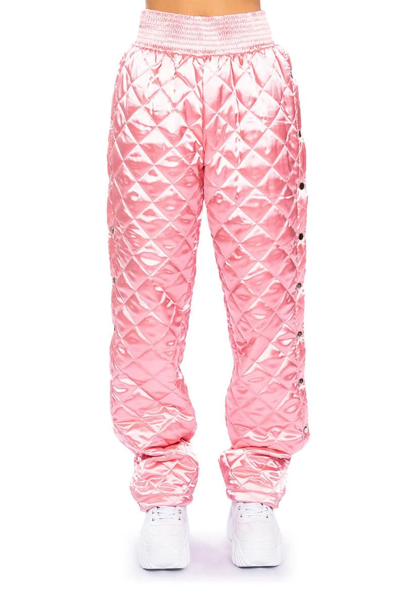 Comfort never looked so cute! The AKIRA Label Cozy Mode Quilted Satin Breakaway Jogger in Pink features a quilted satin fabrication, a high rise waist, a ruched elastic waistband, straight pant legs, silver metallic hardware, and breakaway pop button sides. Pair this piece with the coordinating AKIRA Label Cozy Mode Quilted Satin Vest for a complete look.