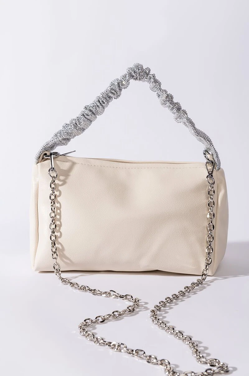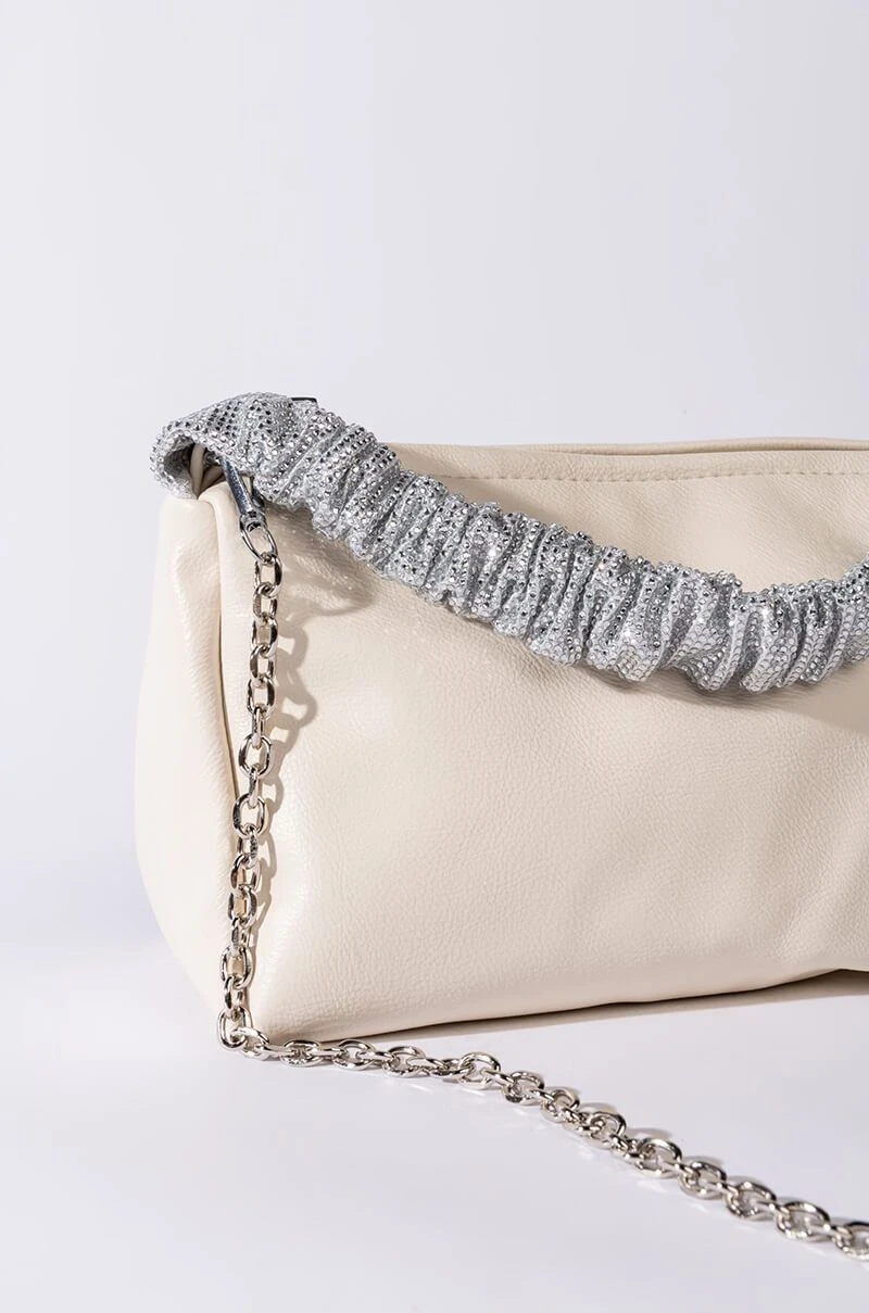 You were meant to cross paths with The AKIRA Label Destiny Rhinestone Strap White Purse. This vegan leather shoulder bag features a scrunched rhinestone handle, soft body, zip top closure, and a detachable chain link shoulder strap.