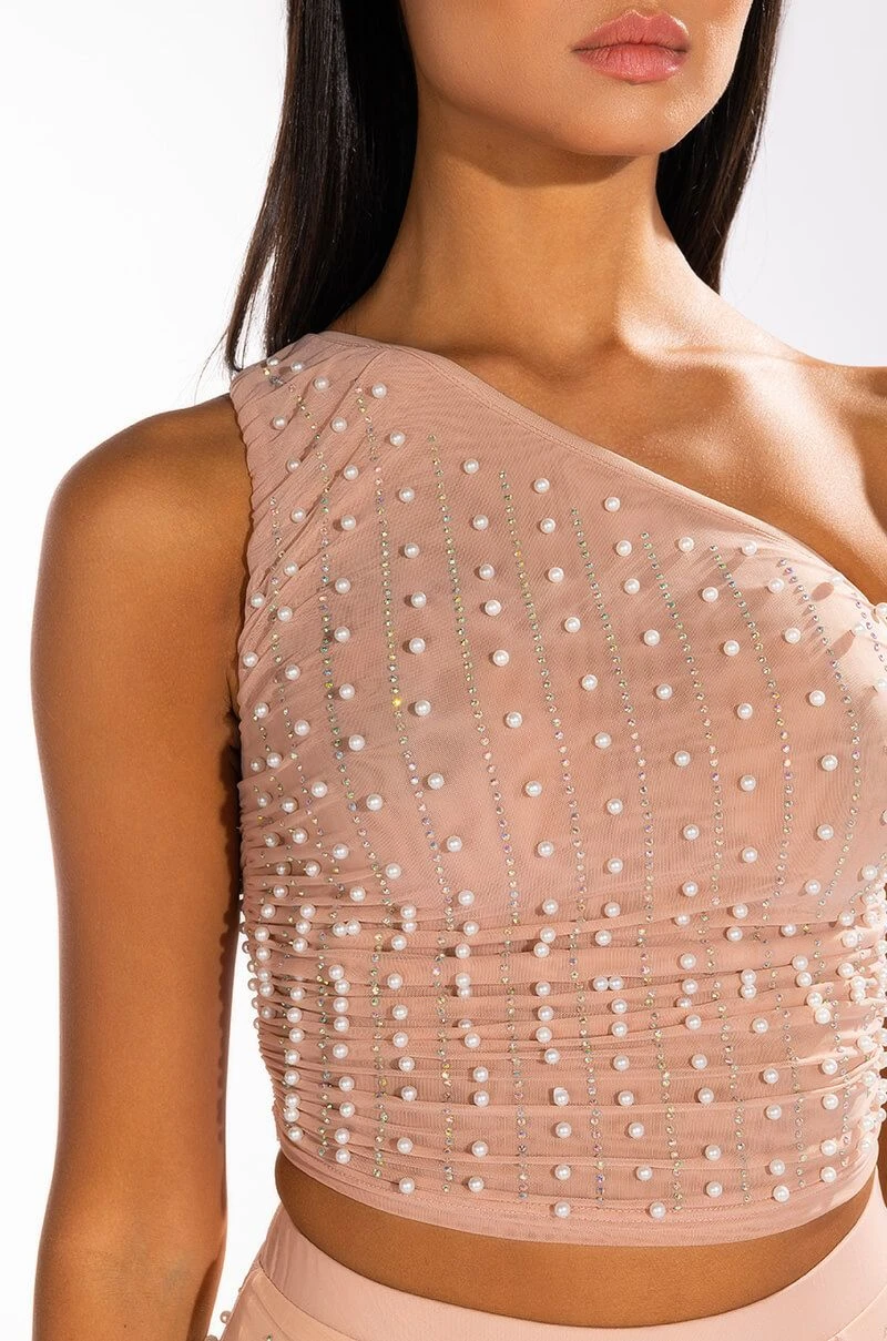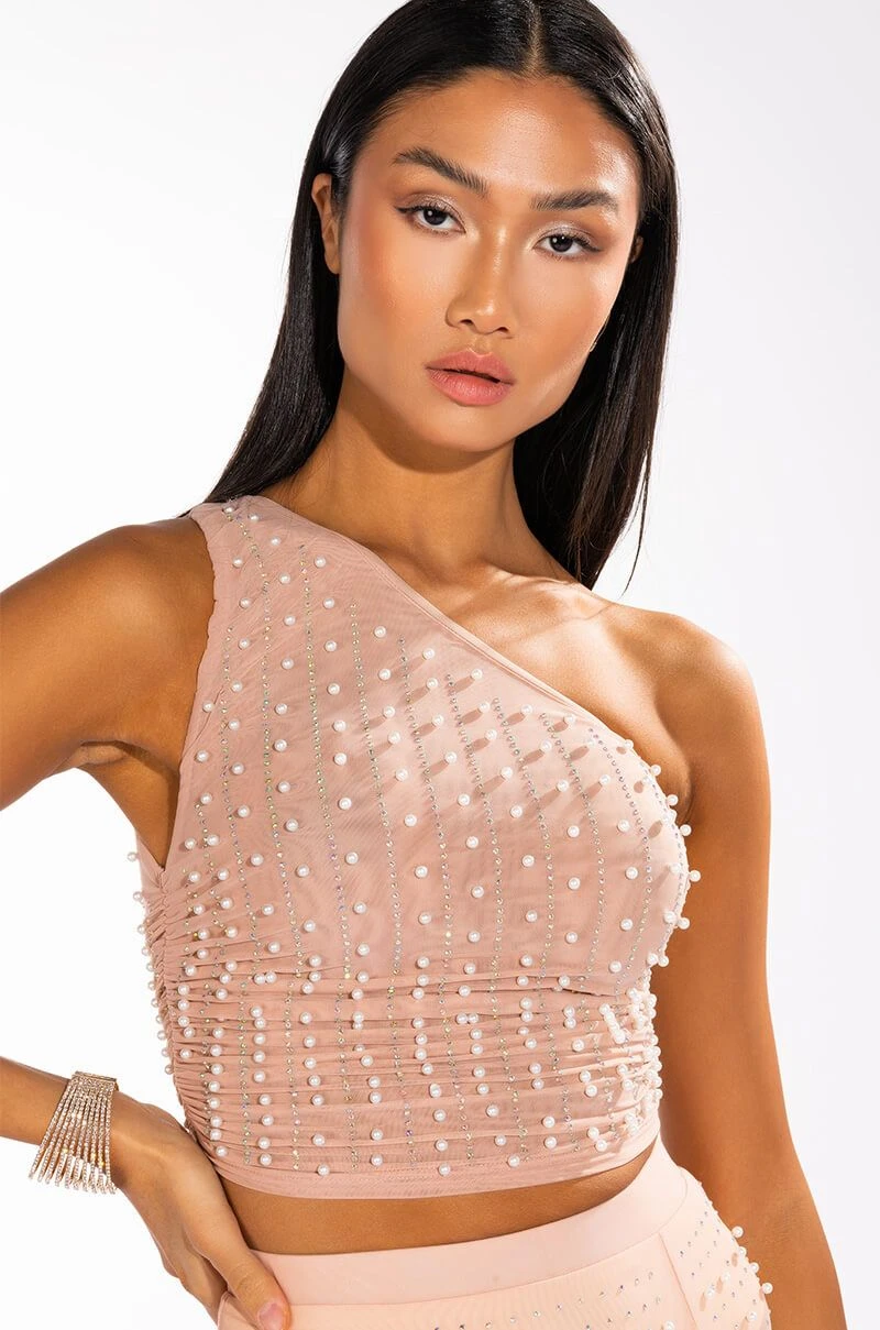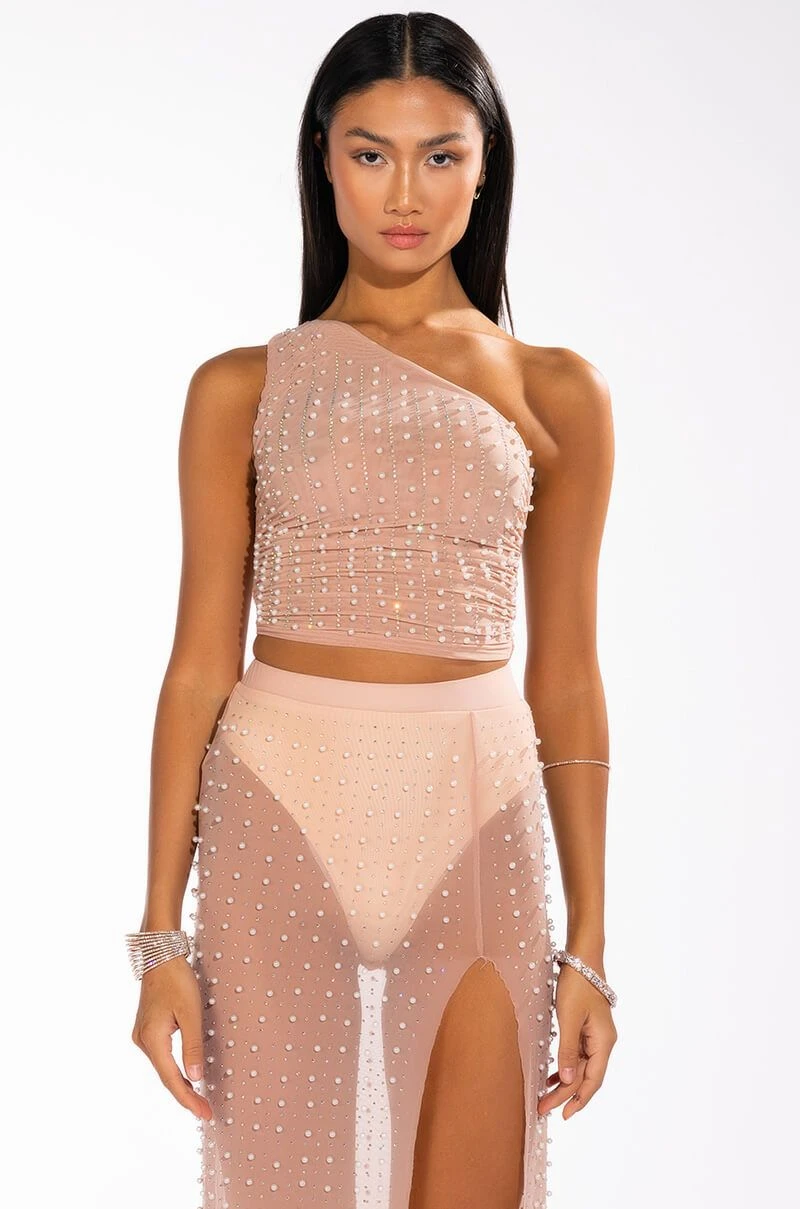 The AKIRA Label Disco Doll Embellished One Shoulder Mesh Crop Top is made from a sheer mesh fabrication and features a one shoulder neckline, iridescent rhinestone and pearl embellishments, ruched side detailing, and a cropped silhouette. Pair this glimmering piece with the coordinating AKIRA Label Disco Doll Embellished High Slit Mesh Maxi Skirt to finish off your dance floor-worthy look!