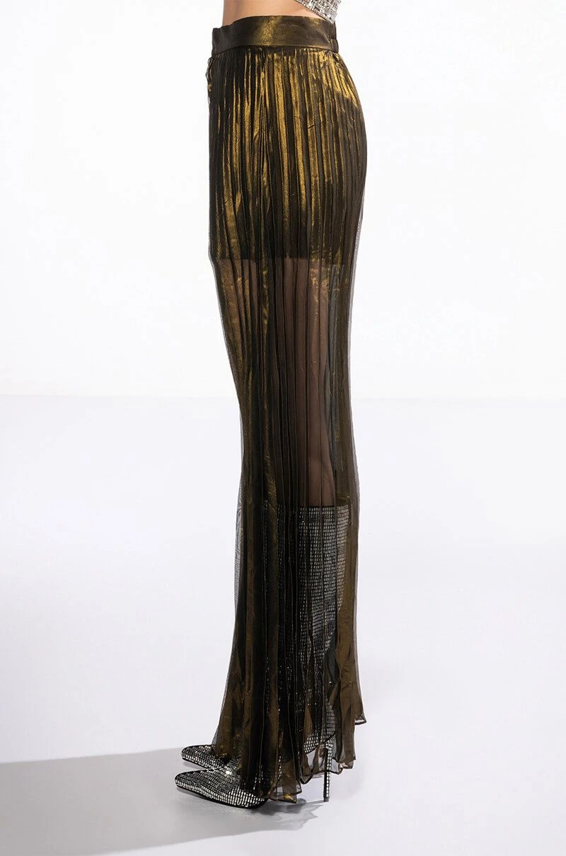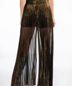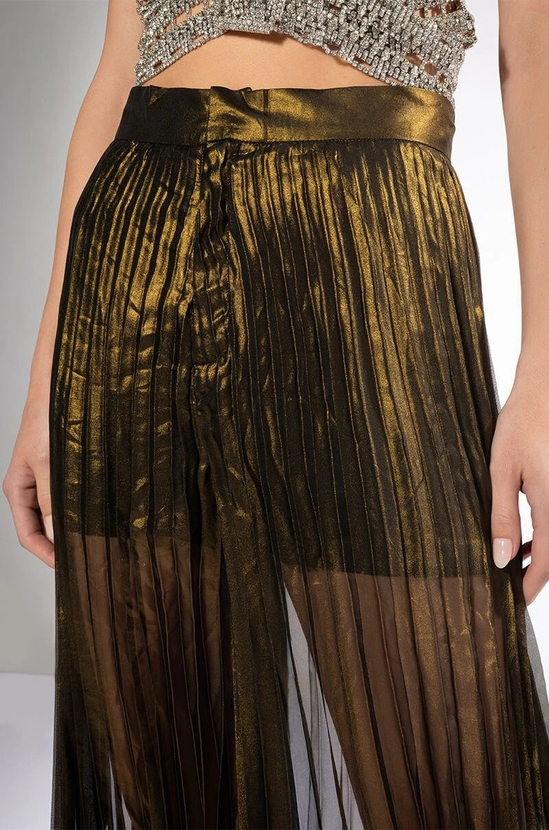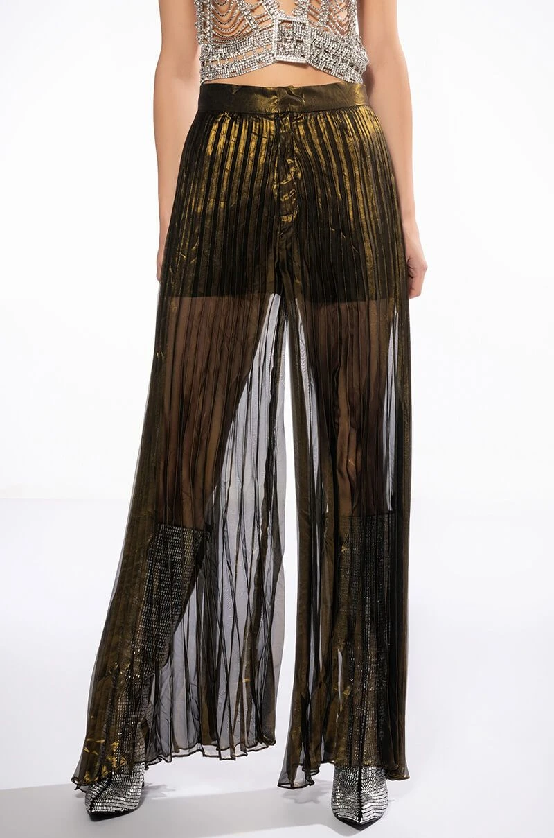 The AKIRA Label Disco Flair Pleated Wide Leg Pants are made from a sheer metallic fabrication and feature a high rise waist with an elastic back waistband, pleated body detailing, attached inner shorts, a wide leg silhouette, and a zippered hook and bar front closure.