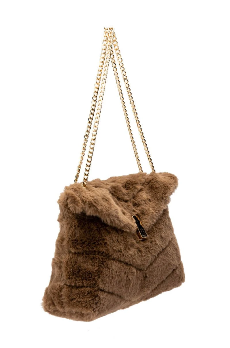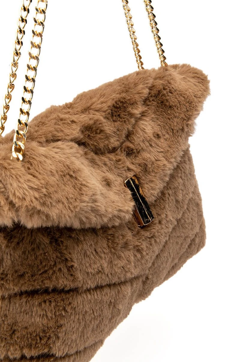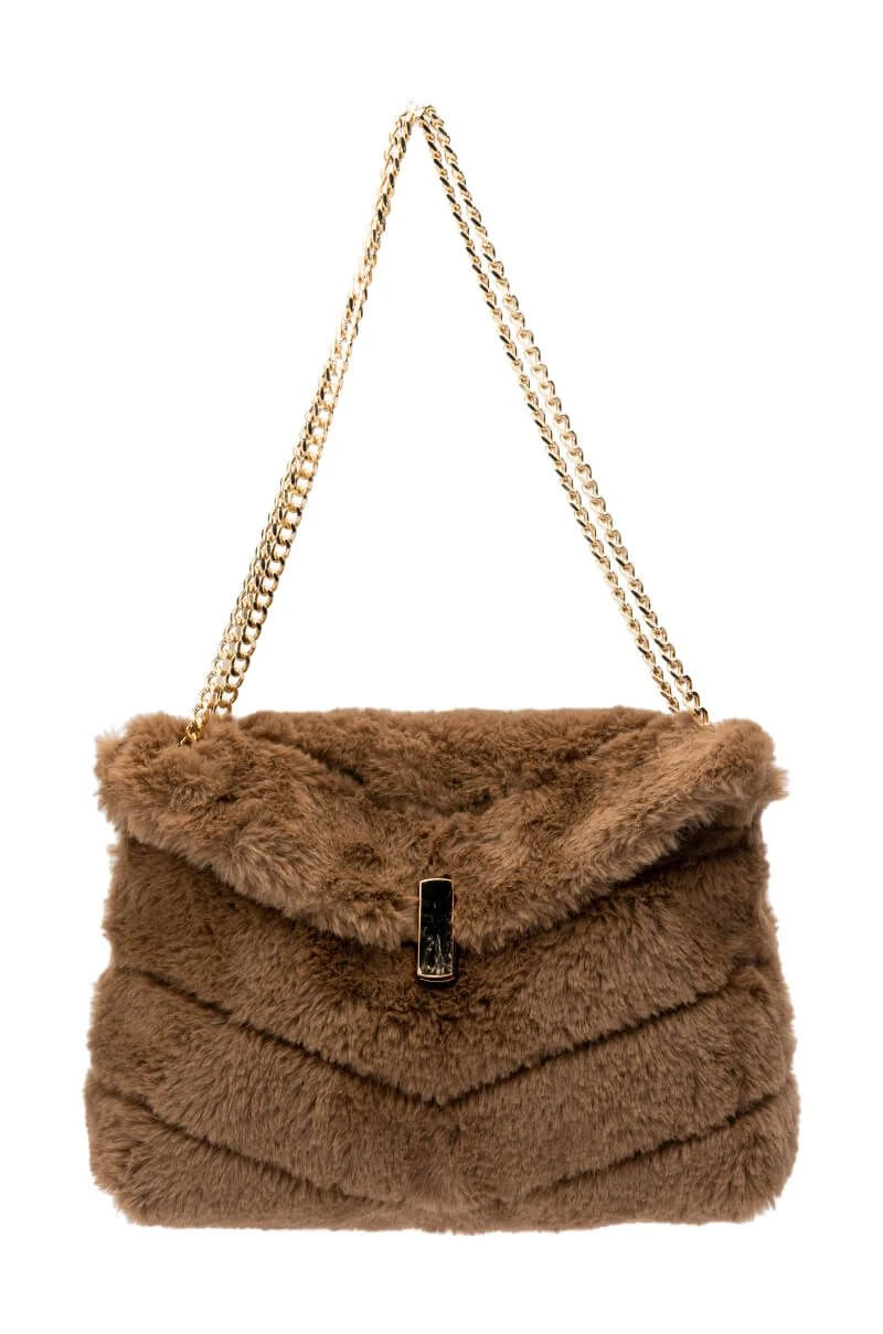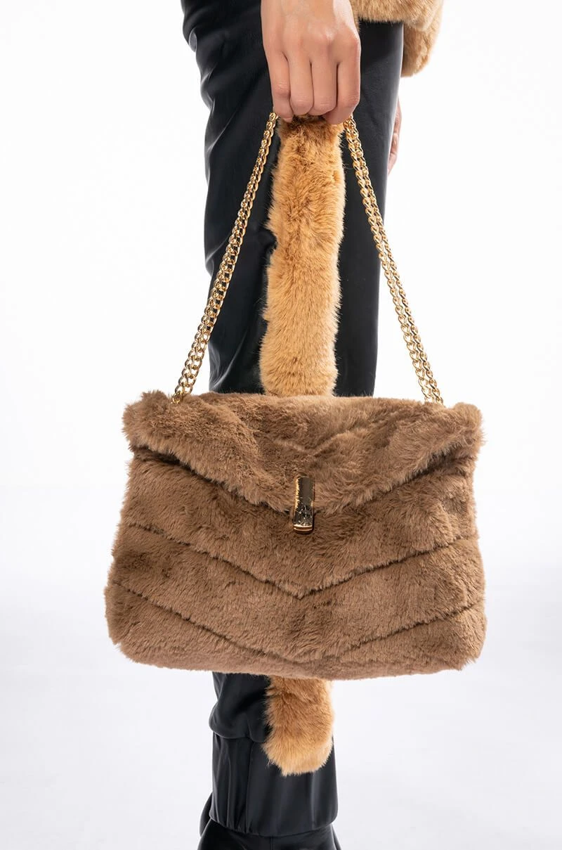 The AKIRA Label Divine Fuchsia Faux Fur Purse features a vegan leather body, a tonal faux fur exterior, a flap front envelope silhouette, a twist front lock closure, and a doubled chain link shoulder strap.Complete with faux gold hardware.
