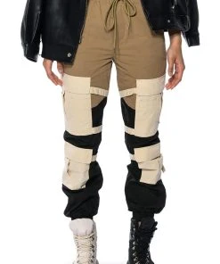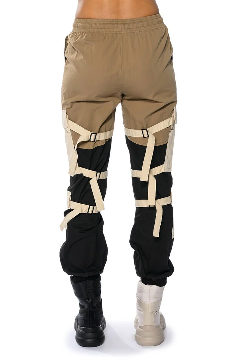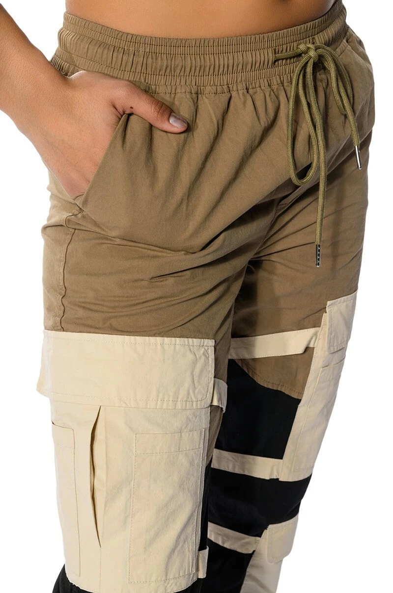 The AKIRA Label Road Trip Color Blocked Cargo Jogger features a structured cotton fabrication, a ruched elastic waistband, drawstring detailing, slant side pockets, cargo thigh and ankle pockets,and cinched ankle hems. Complete with strappy accents and a color block construction. Pair these unique bottoms with a crop top and chunky sneakers.