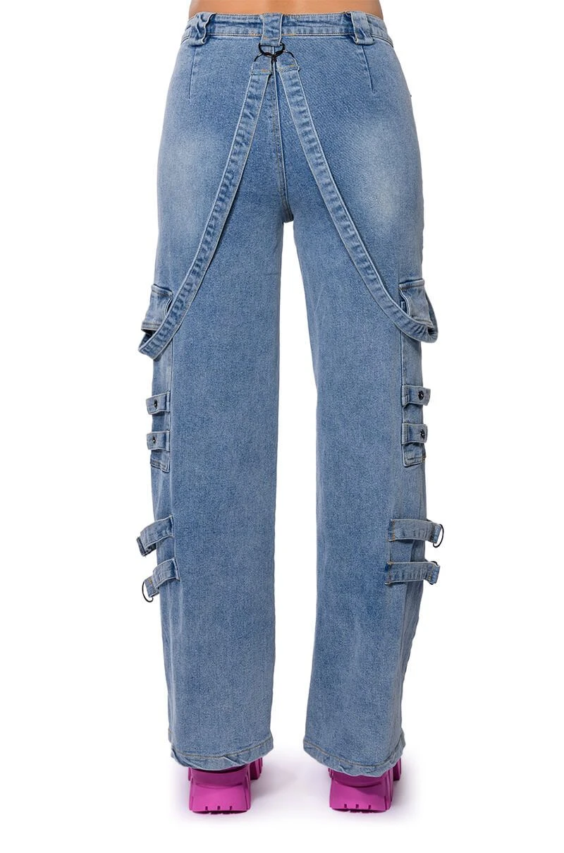 The AKIRA Label Dont Take Him Back Wide Leg Suspender Cargo Jeans are made from a washed denim fabrication and feature a high rise waist, working suspenders, belt loops, patch front pockets, cargo flap side pockets, D-ring denim belt detailing, and a wide leg silhouette. Complete with a front button and zipper closure.