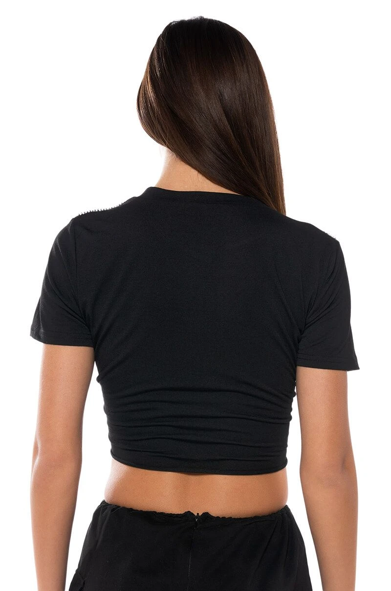 The AKIRA Label Double Take Embellished T Shirt In Black is made from a stretchy, lightweight base fabric and features an open front crew neck, short sleeves, and a nude graphic print design with silver ring detail. Complete with rhinestone fringe embellishments on the shoulders, a cropped silhouette, and a front self-tie closure. Style with wide leg denim and cowboy boots for an extra edge to your look.