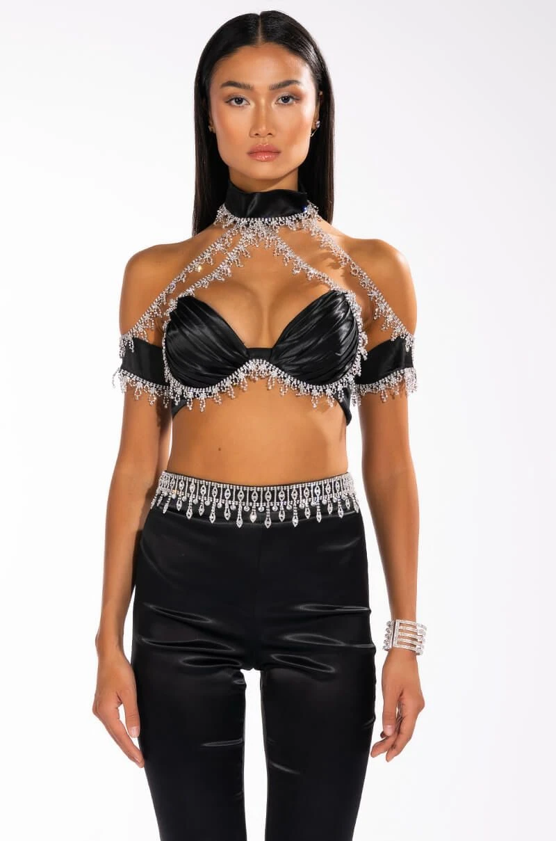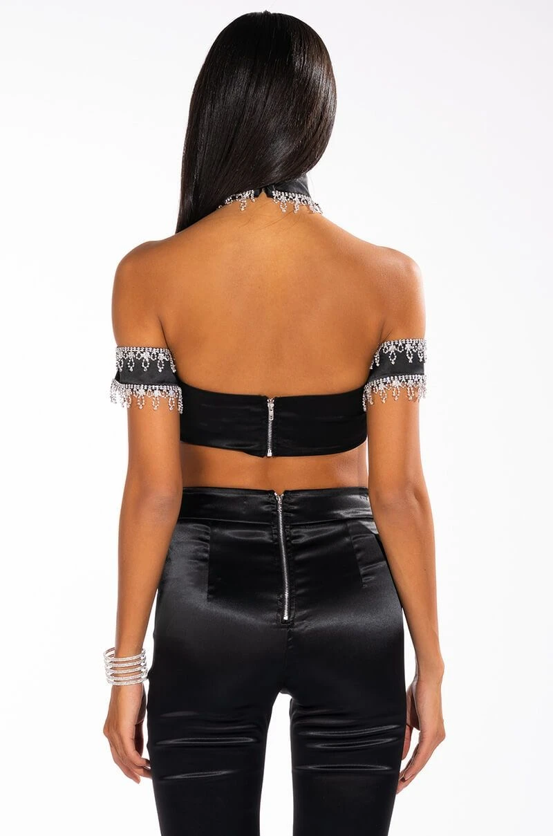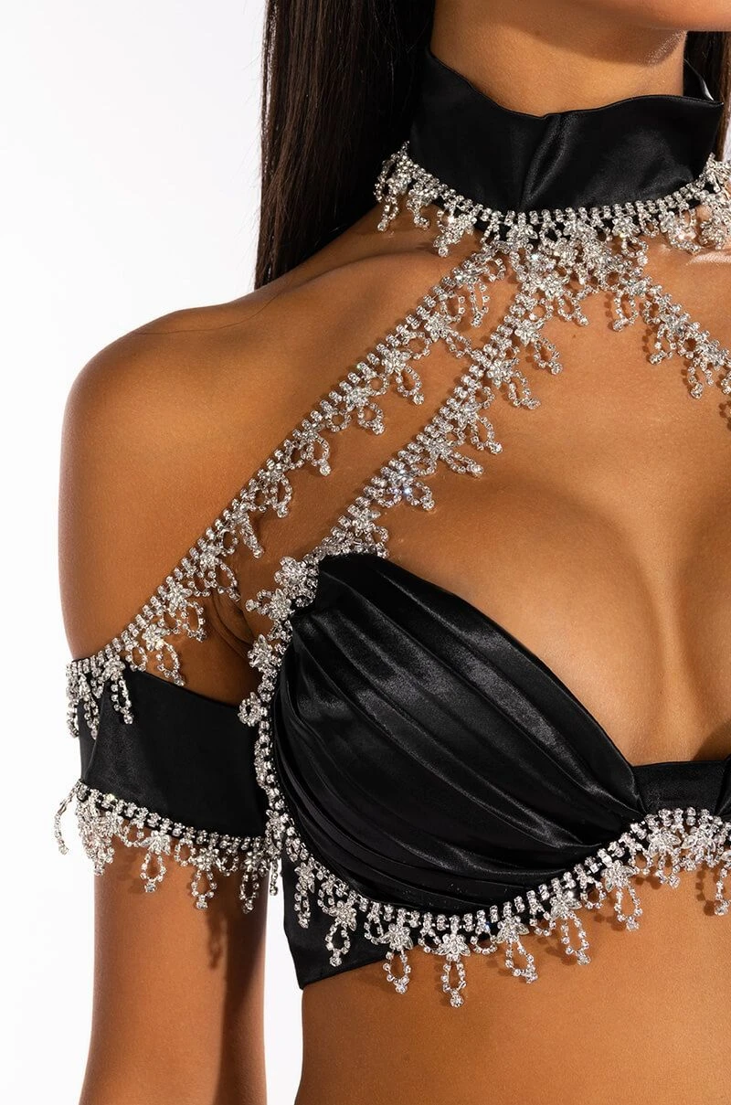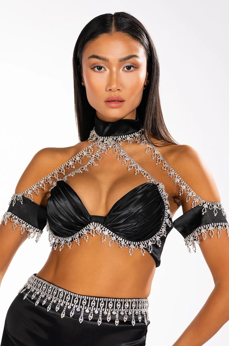 The AKIRA Label Drenched In Diamonds Satin Bra Top is made from a luxe satin fabrication and features a hook and eye back mock neckline with opulent rhinestone chain trim connected to a rhinestone-trimmed off the shoulder crop top with plunging, pleated, padded cups and an exposed back zipper closure. Pair this piece with the coordinating AKIRA Label Drenched In Diamonds Satin Pant to complete your look!