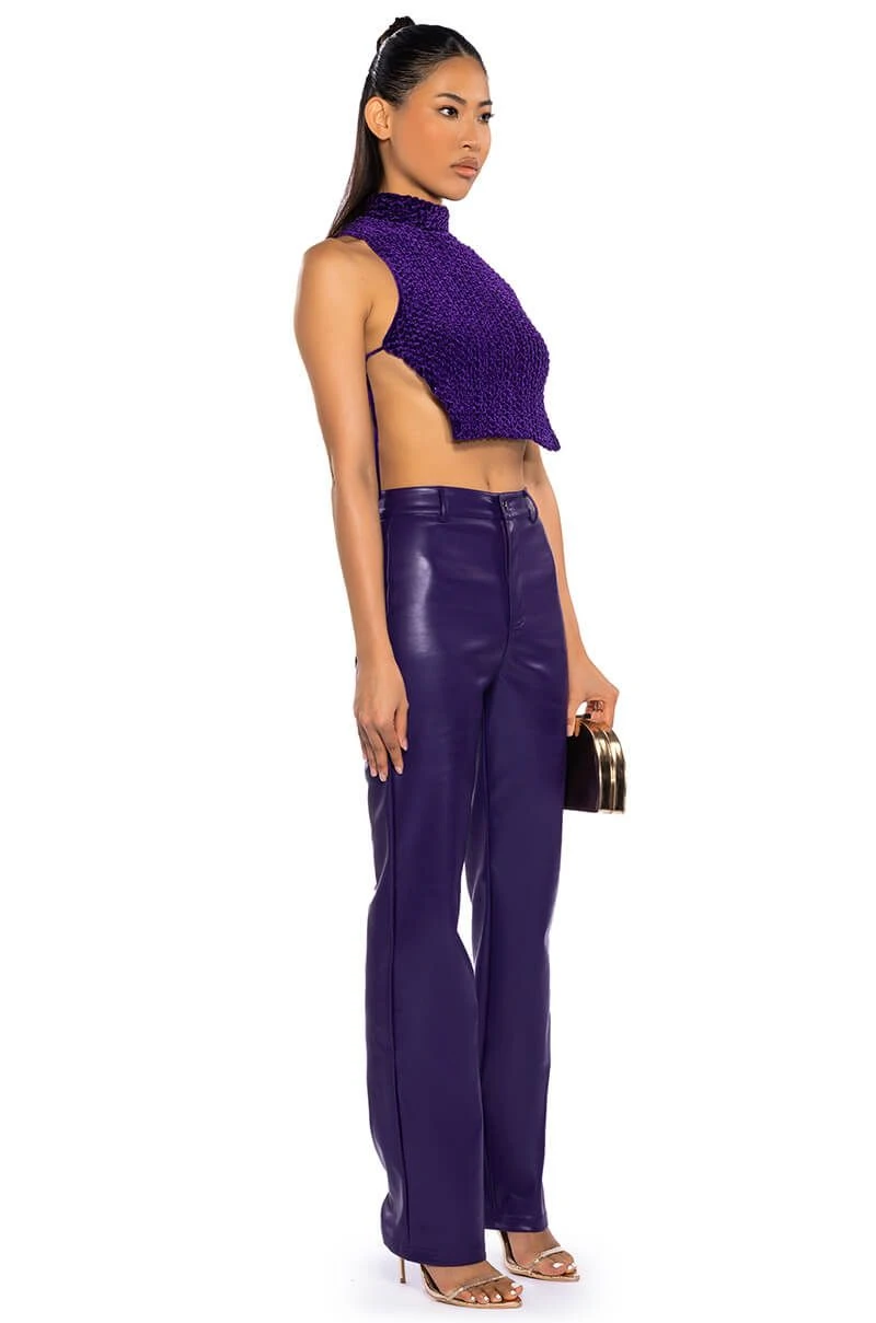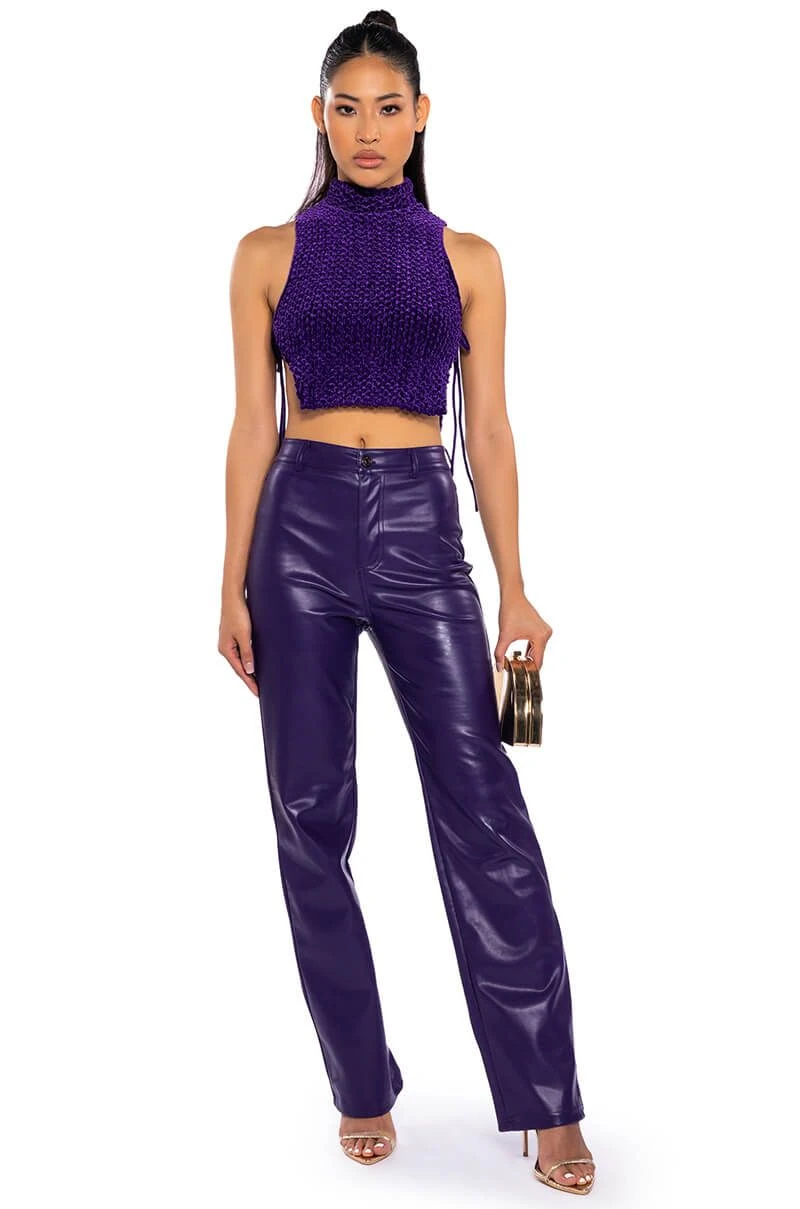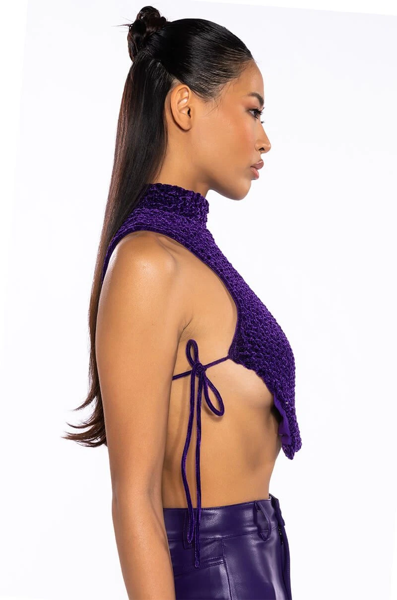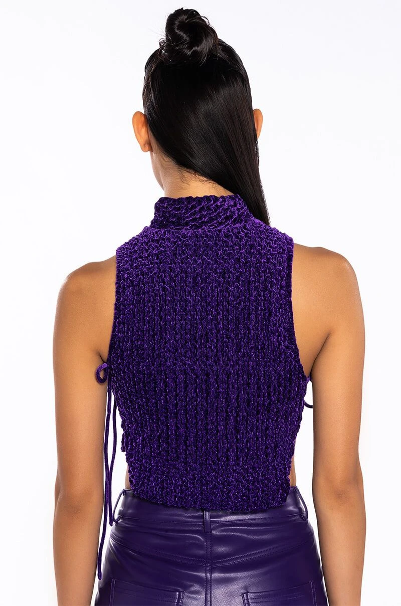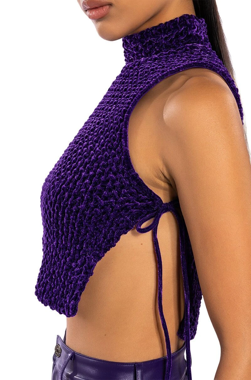 The AKIRA Label Echo Velvet Sleeveless Top in Purple features a textured velvet fabrication, a mock neckline, a sleeveless silhouette, sexy open tie-up sides, a nylon inner lining, and a cropped cut. Complete your look with pleather leggings and chunky booties.
