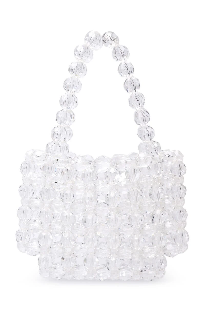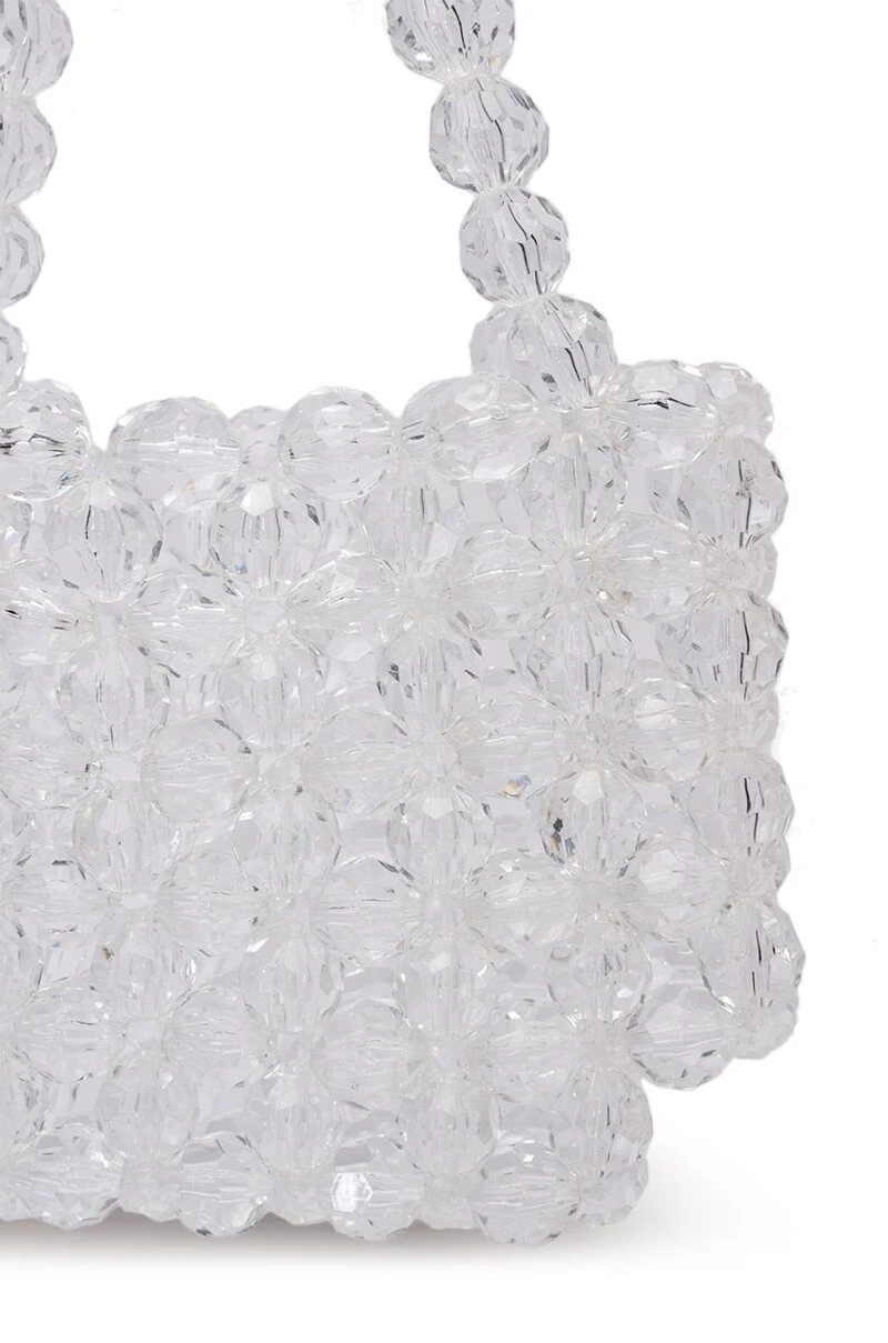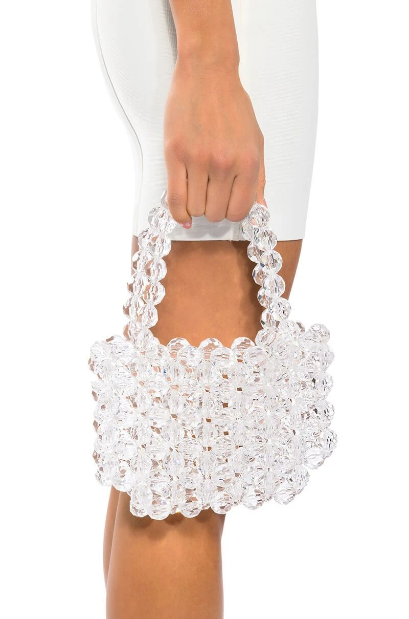 The AKIRA Label Enchanted Beaded Bag in Clear is an intricate mini bag featuring a clear beaded base, a mini body, dual top handles, and an open top. Pair with your fave ensembles for a chic and sweet look.
