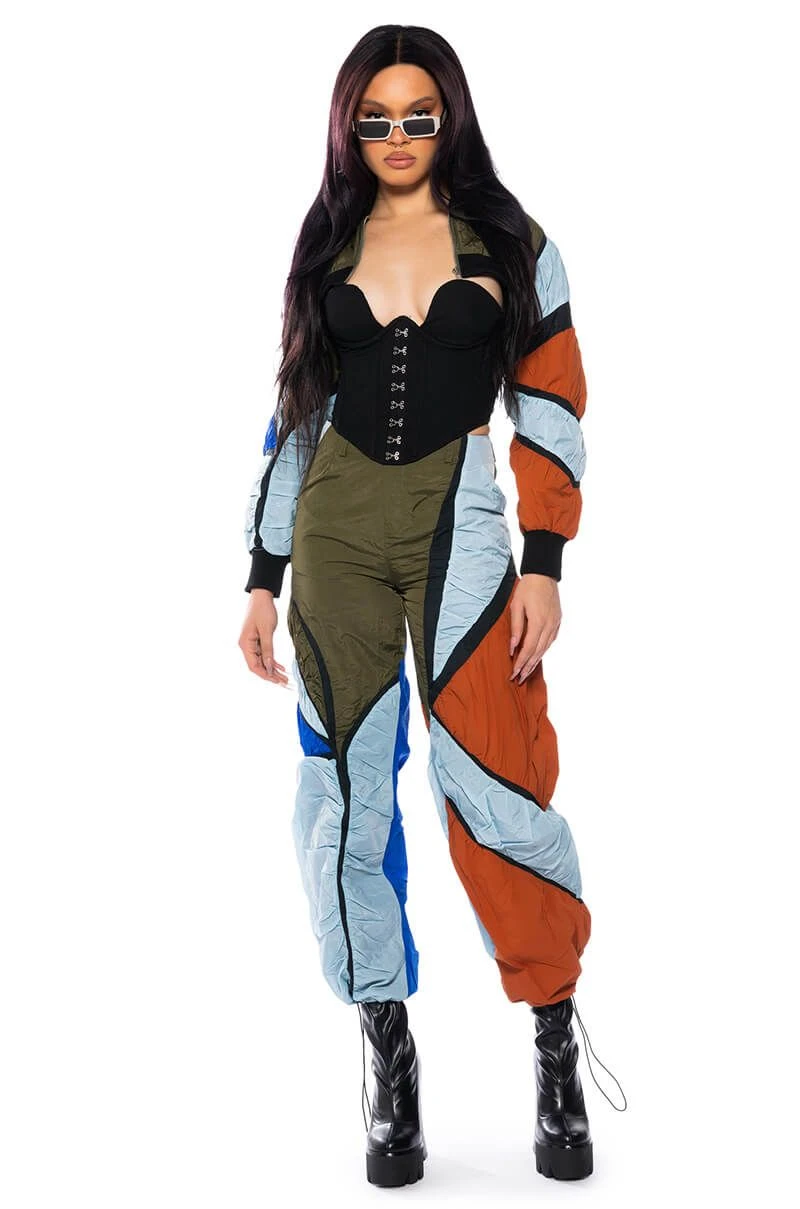 The AKIRA Label Enjoy The Ride Multicolored Ruched Pants are part of a chic and bold two-piece set, made from a lightweight, nylon base fabrication. It features a sleek waistband, an abstract color block design, ruching along the sides and legs, and slant side pockets. Complete with a parachute-pant silhouette, high rise waist with zipper to hook-and-eye front closure, and adjustable drawstring bottom hems. Style with the matching top, The AKIRA Label Enjoy The Ride Multicolored Crop Bomber, and slides for an off-duty athleisure ensemble.