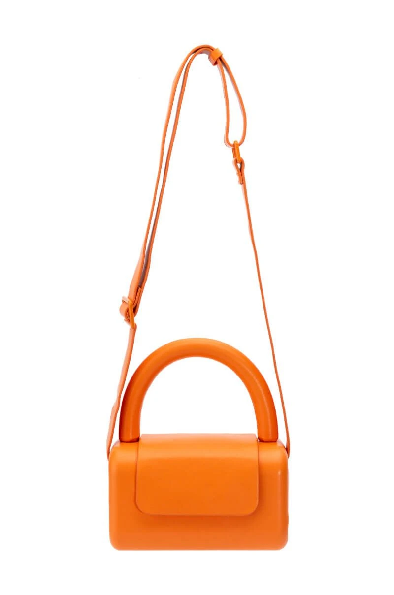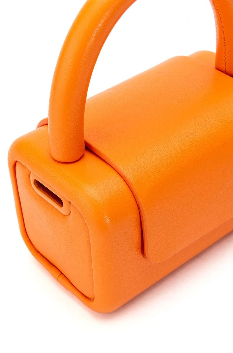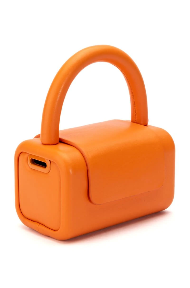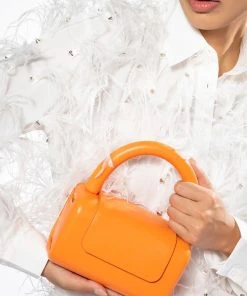 The AKIRA Label Everly PU Box Bag In Orange features a faux leather box frame mini body, a top handle silhouette, a coordinating detachable faux leather strap, and a magnetic flap front closure.