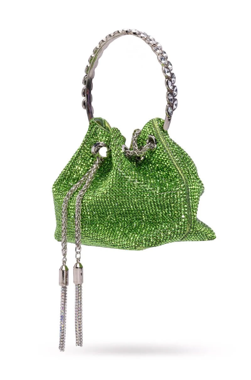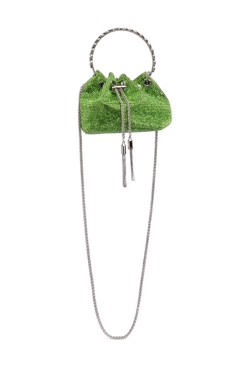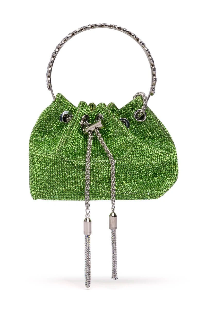 The AKIRA Label Feeling Lucky Rhinestone Pouch Pures is an ultra luxe mini bucket bag featuring a rhinestone-embellished base, a silver metallic top handle with rhinestone detailing, and a silver metallic toggle closure.