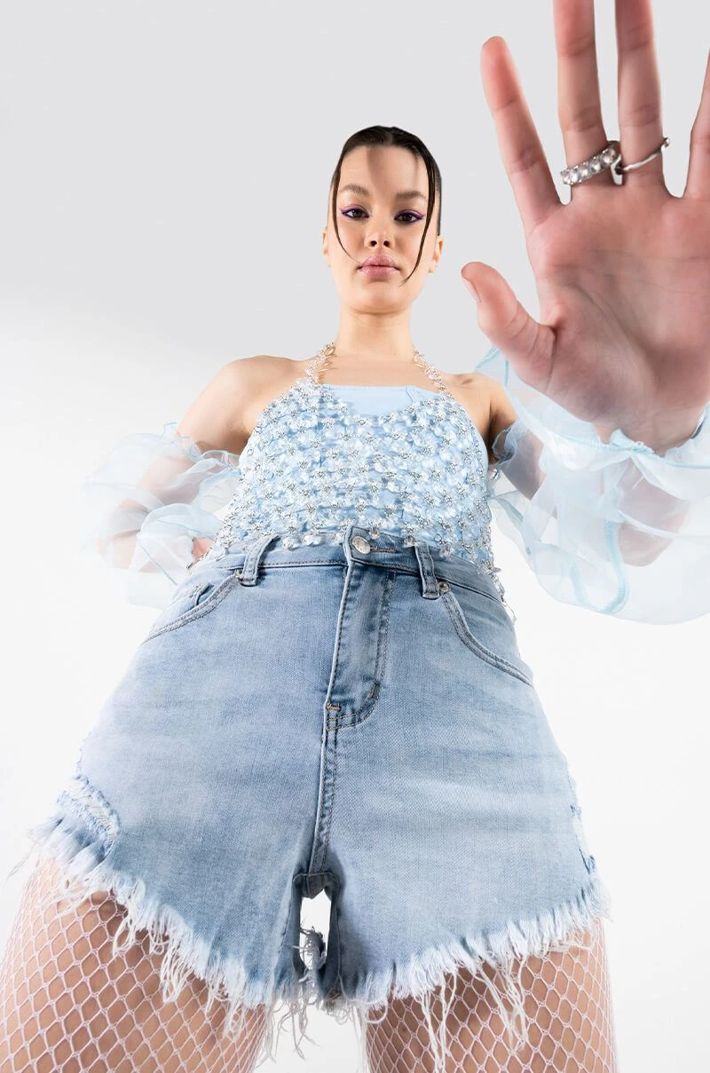 Snatch your waist and show off that booty in style with The AKIRA Label Flex Fit Extreme Stretch High Waisted Denim Shorts! These stretchy faded denim bottoms feature a curve-hugging construction, a high rise waist, a classic zip button closure, distressed detailing, and a raw hemline. Complete with a functional five pocket design, working belt loops, and silver metallic hardware. Style these with your favorite crop tops and sleek ankle booties for a casual moment that puts your sexy self front and center.
