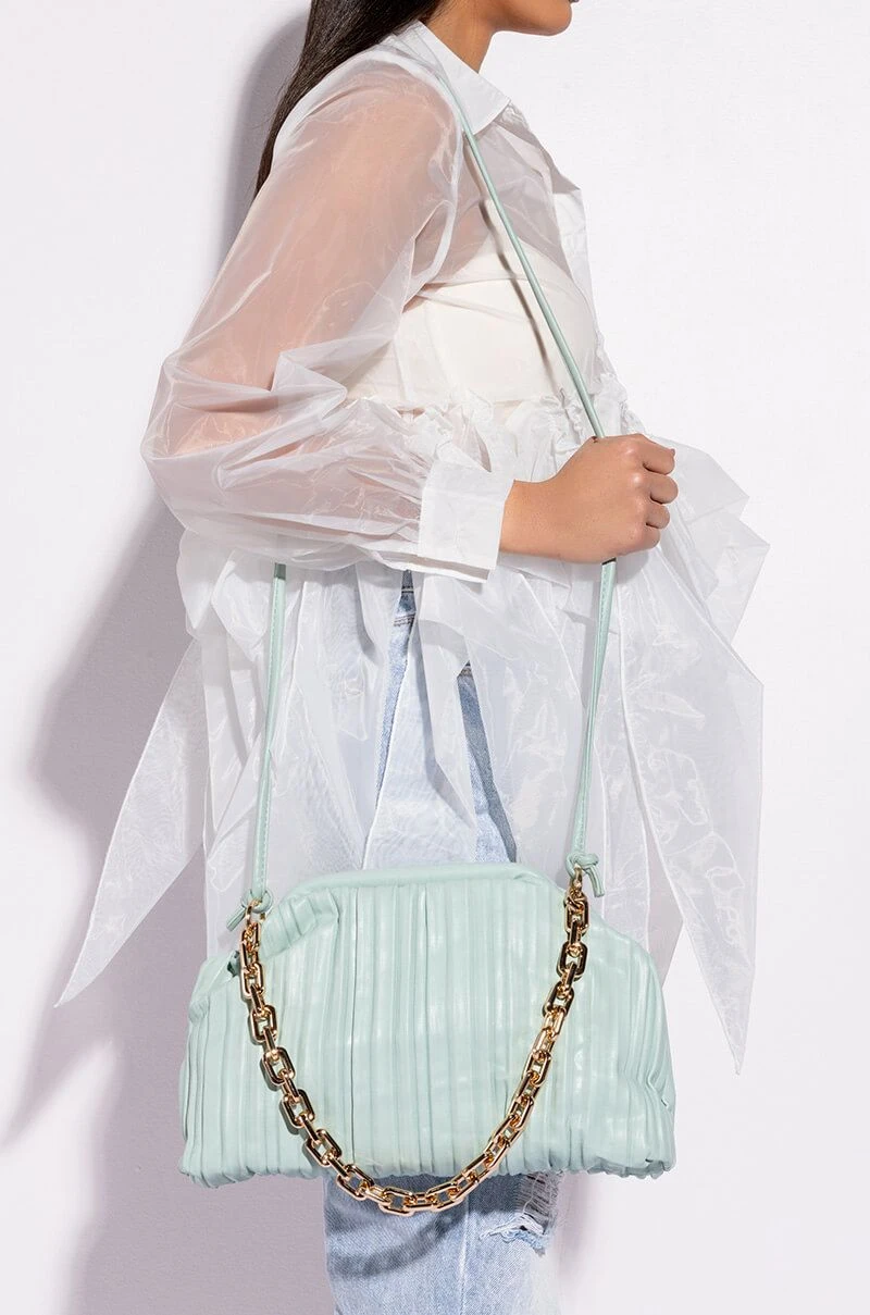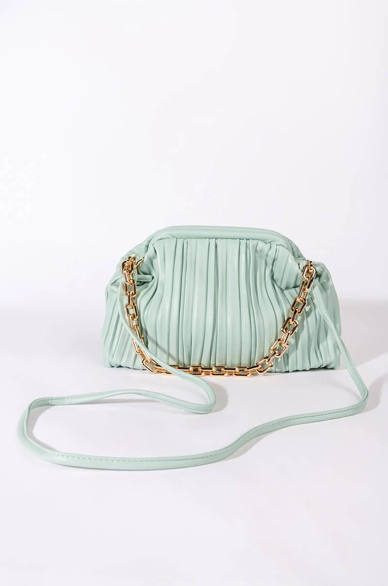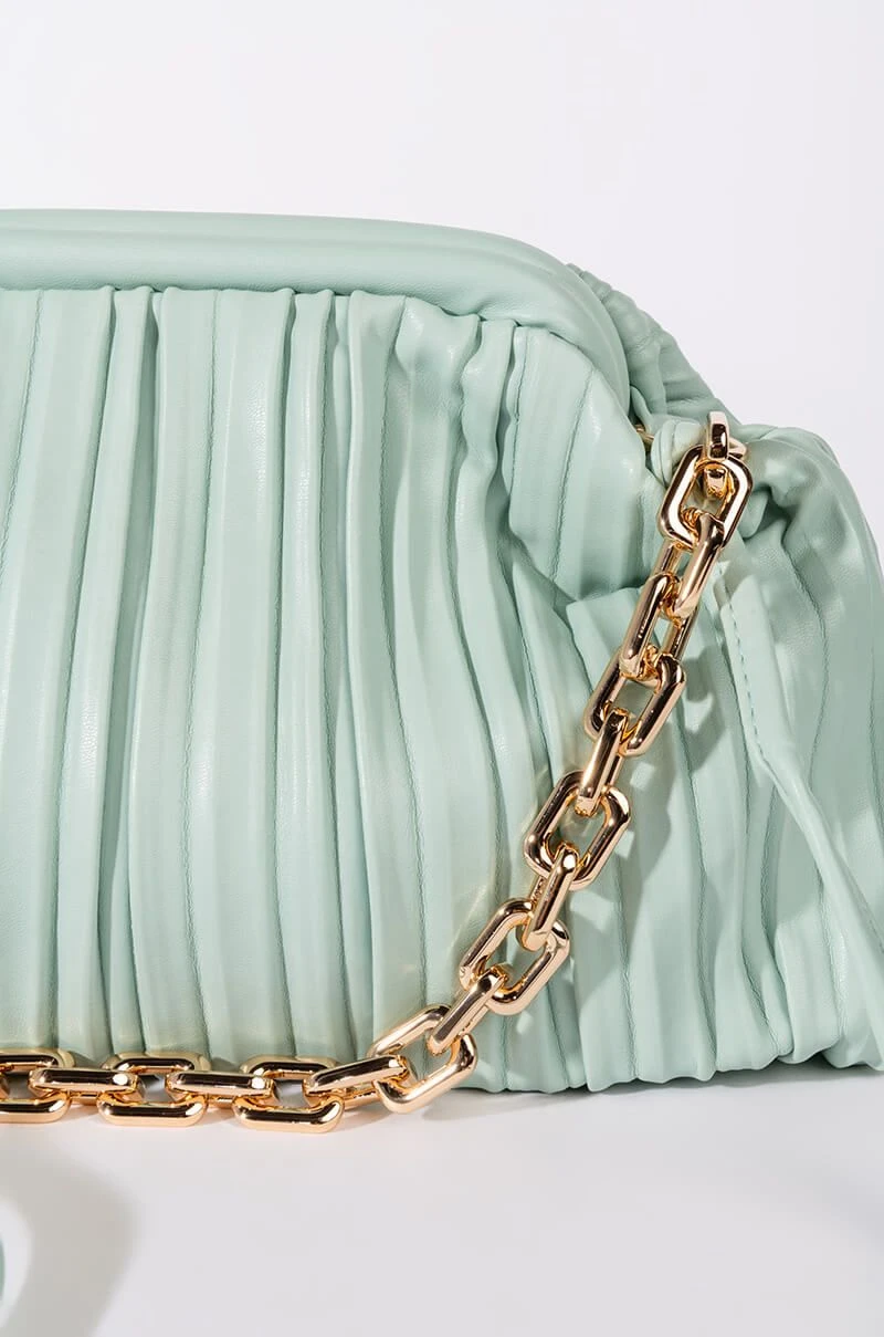 The AKIRA Label Flume Light Green Clutch Bag is a vegan leather shoulder bag featuring a pleated faux leather base, a faux gold chain link top handle, a snap closure frame silhouette, and a detachable leather shoulder strap.