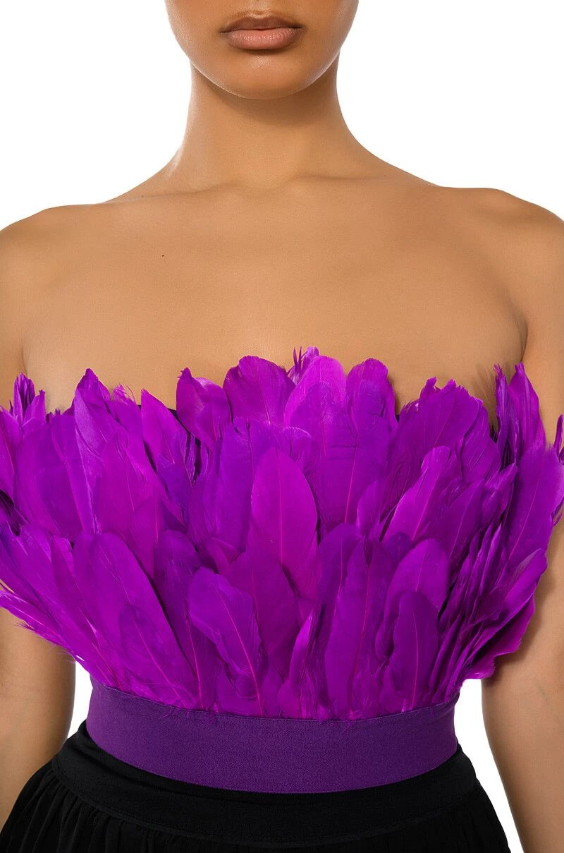 The AKIRA Label Fly Away Feather Tube Top is made from soft base material and a front feather design. It features a strapless silhouette, layered feather bodice detailing, a cropped length, inner padded cups, and a corset bodice. Complete with a tonal elastic band and back zipper closure. Pair with skinny jeans and chunky boots for an angelic look!