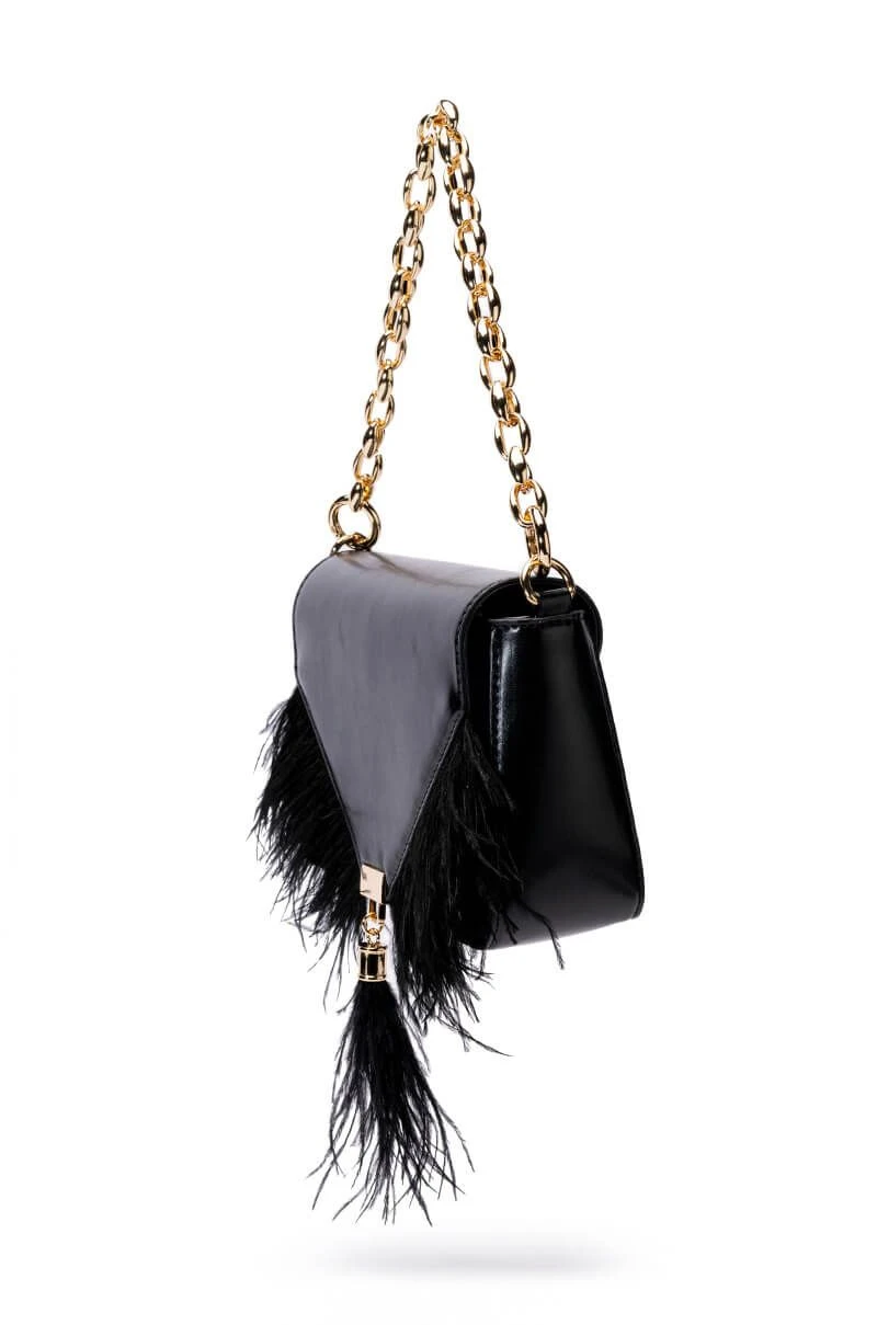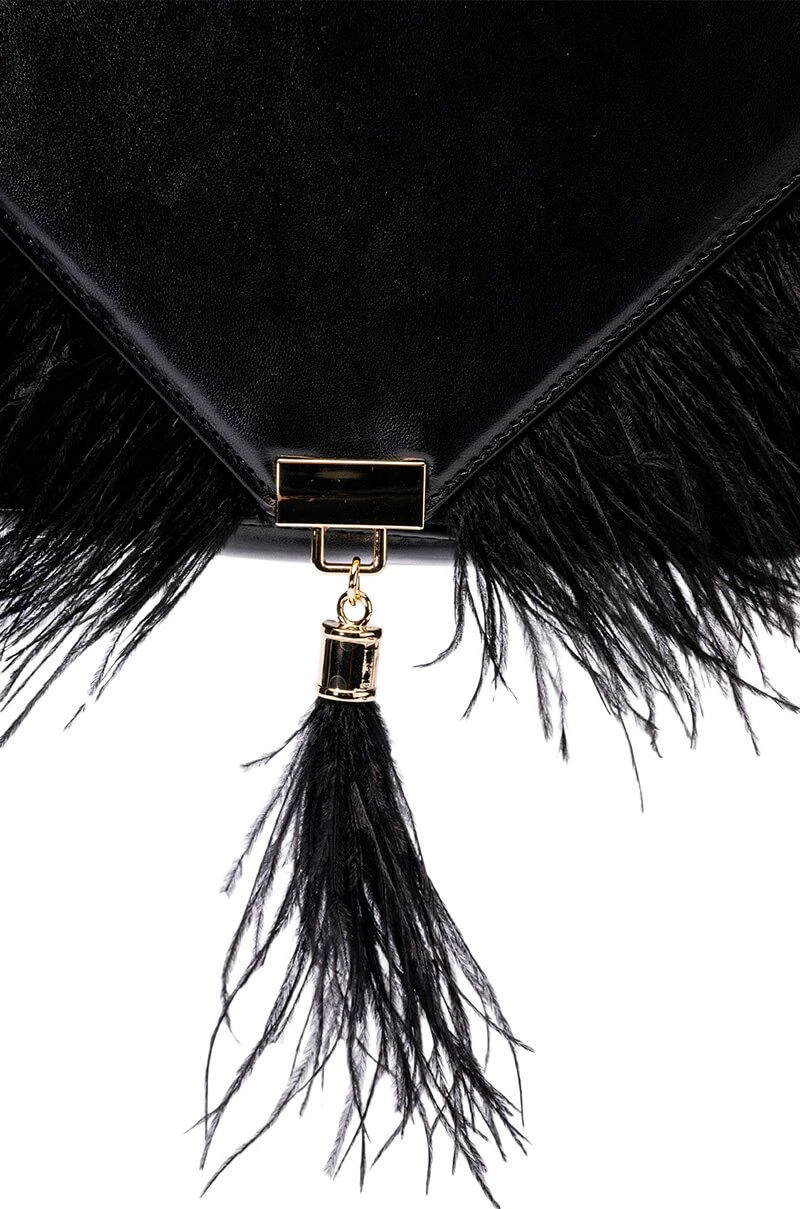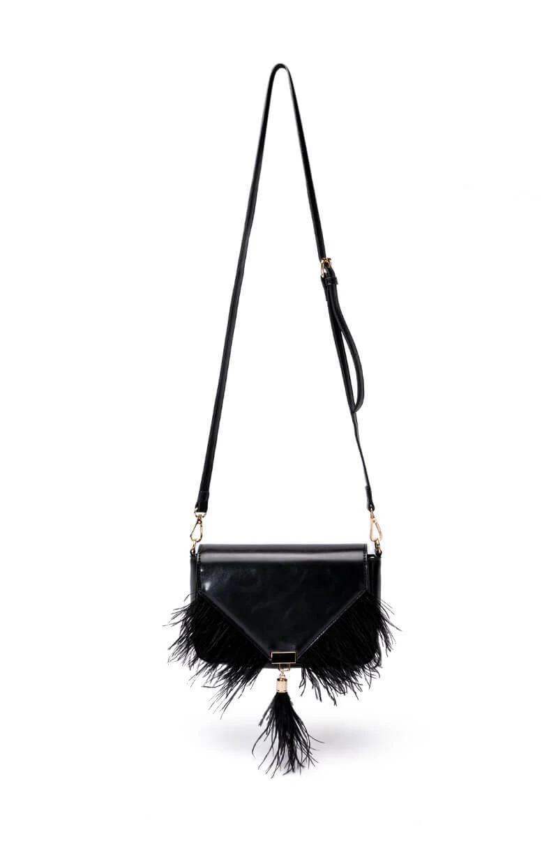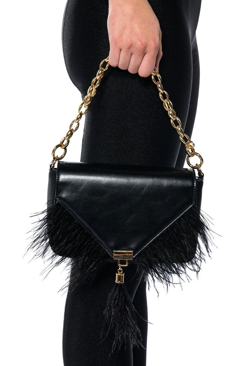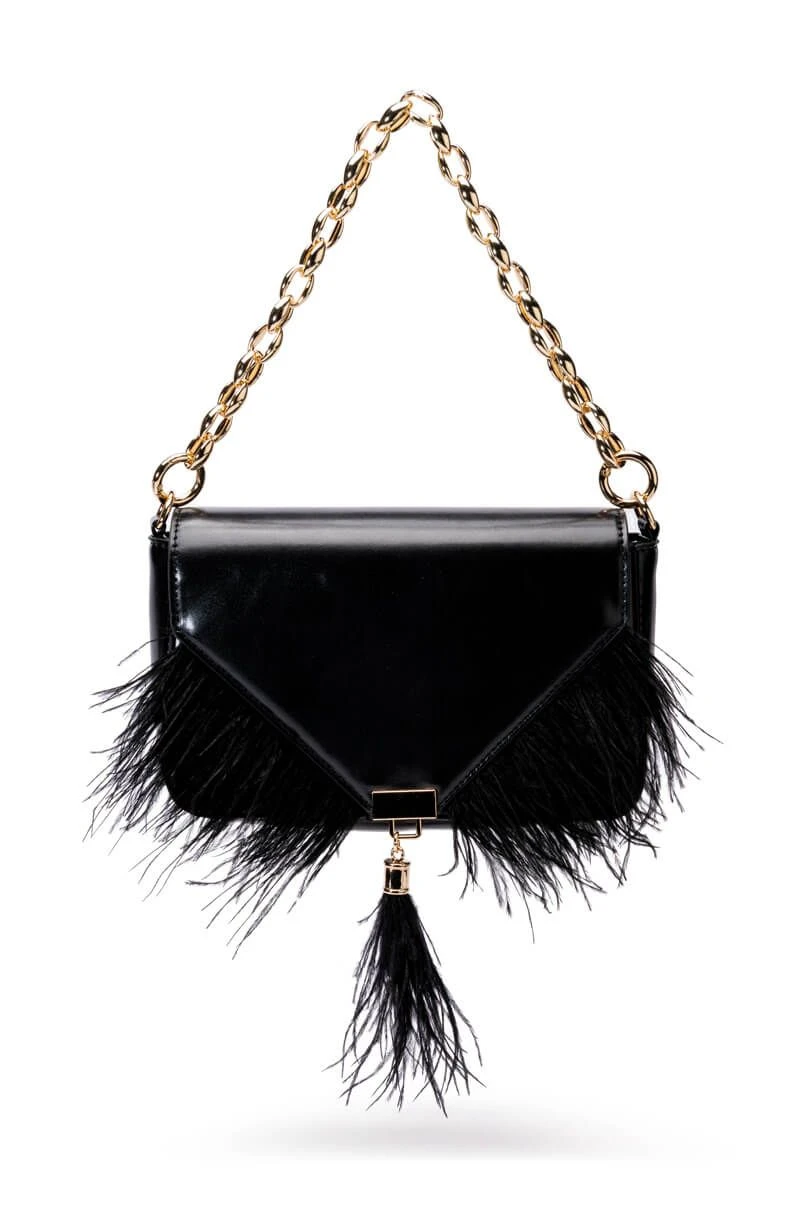 The AKIRA Label Foxtrot Feather Bag is made from a soft vegan leather fabrication and features a boxy silhouette, a detachable chain top handle, a front flap with opulent feather trim and tassel, and a magnetic snap button front closure. Complete with an included adjustable vegan leather shoulder strap.