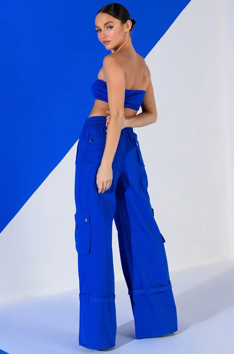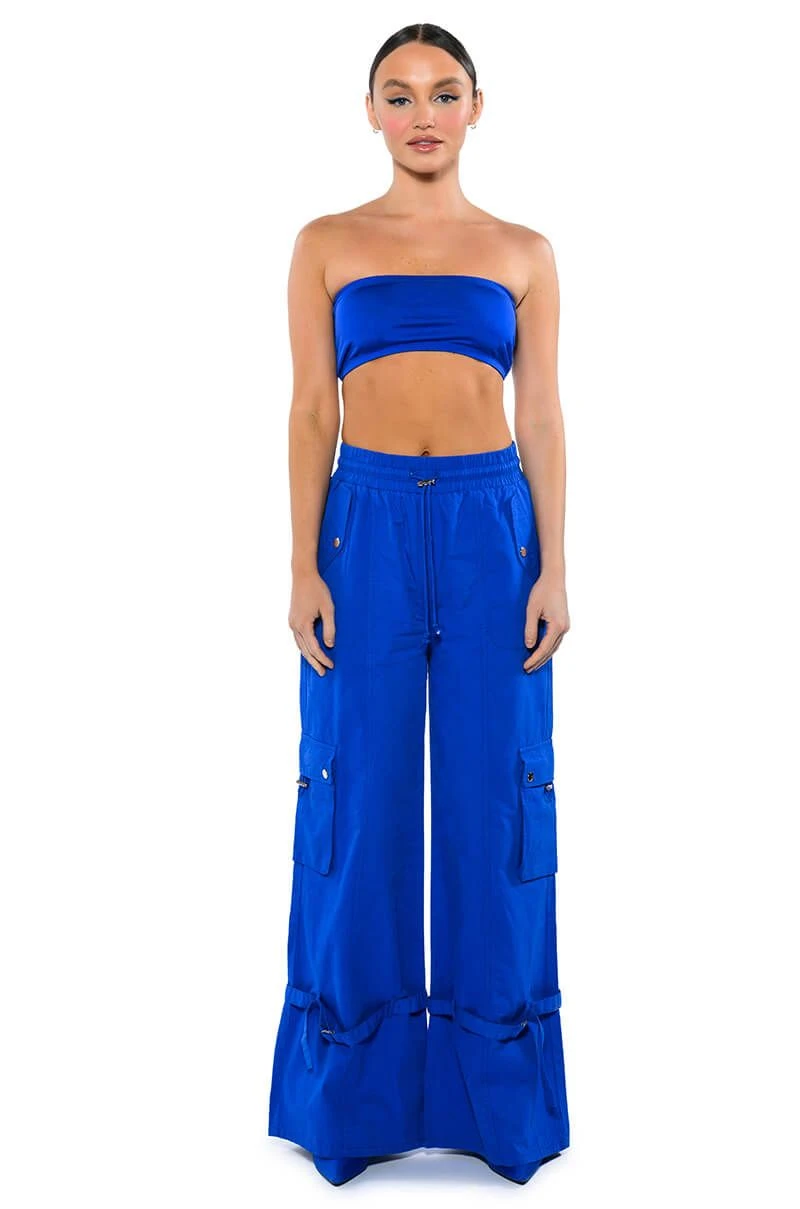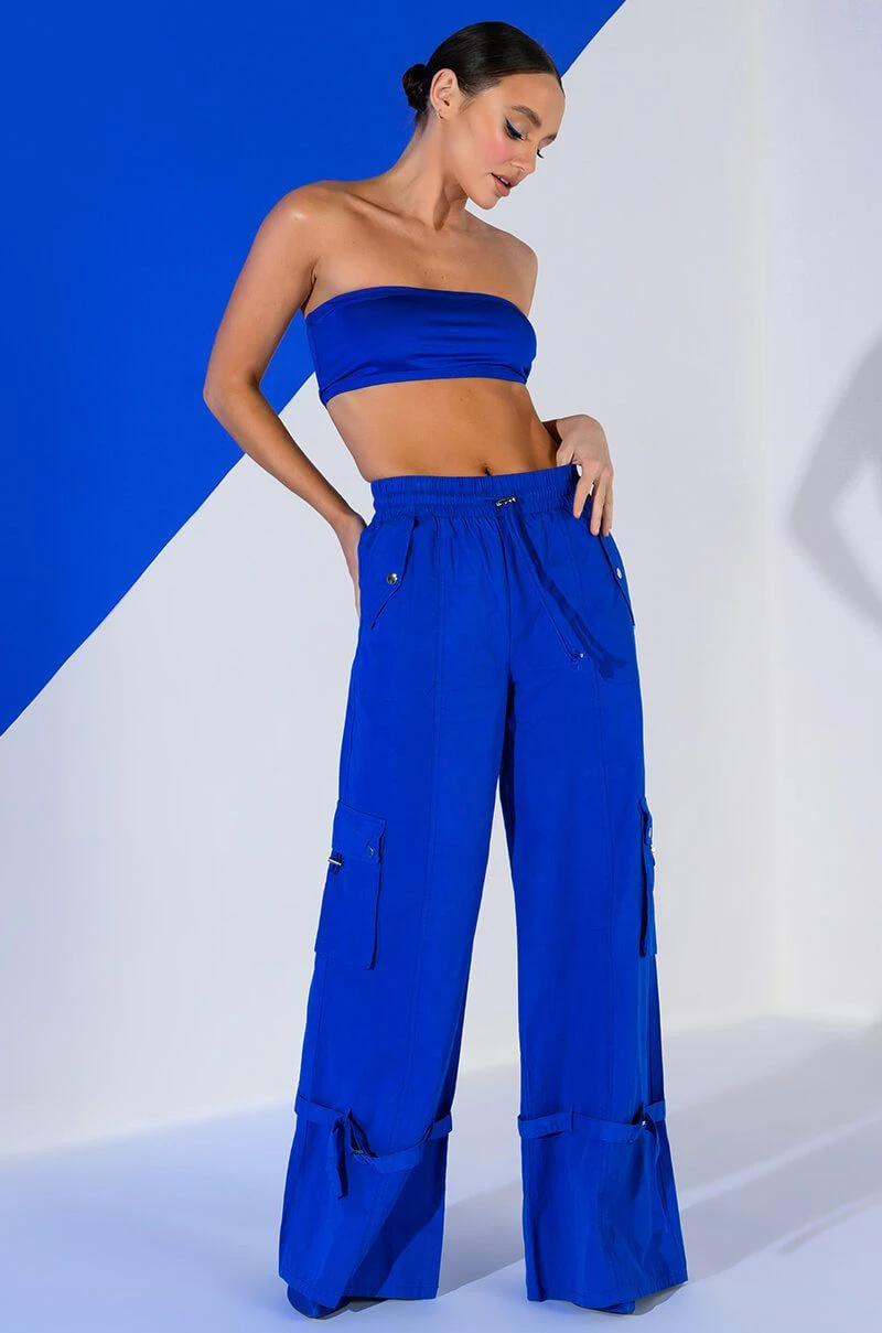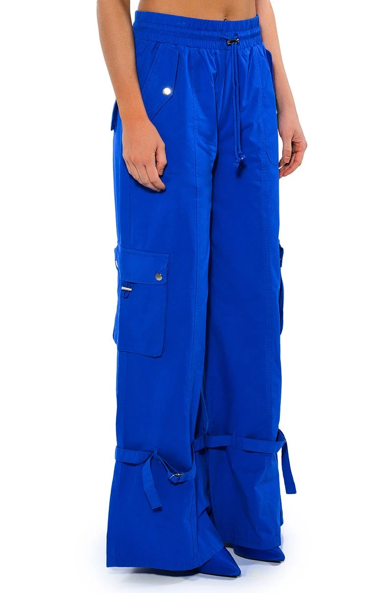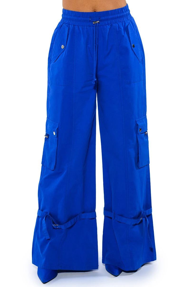 Comfy and trendy, The AKIRA Label Frenchy Wide Leg Cargo Pant is made from a smooth, lightweight fabrication, and features an elastic, ruched drawstring waistband and side cargo flap pocket design. Complete with back flap pockets, a high waist, adjustable ankle cinching straps, and a wide leg silhouette. Pair these pants with a cropped tee and booties for an effortless look!