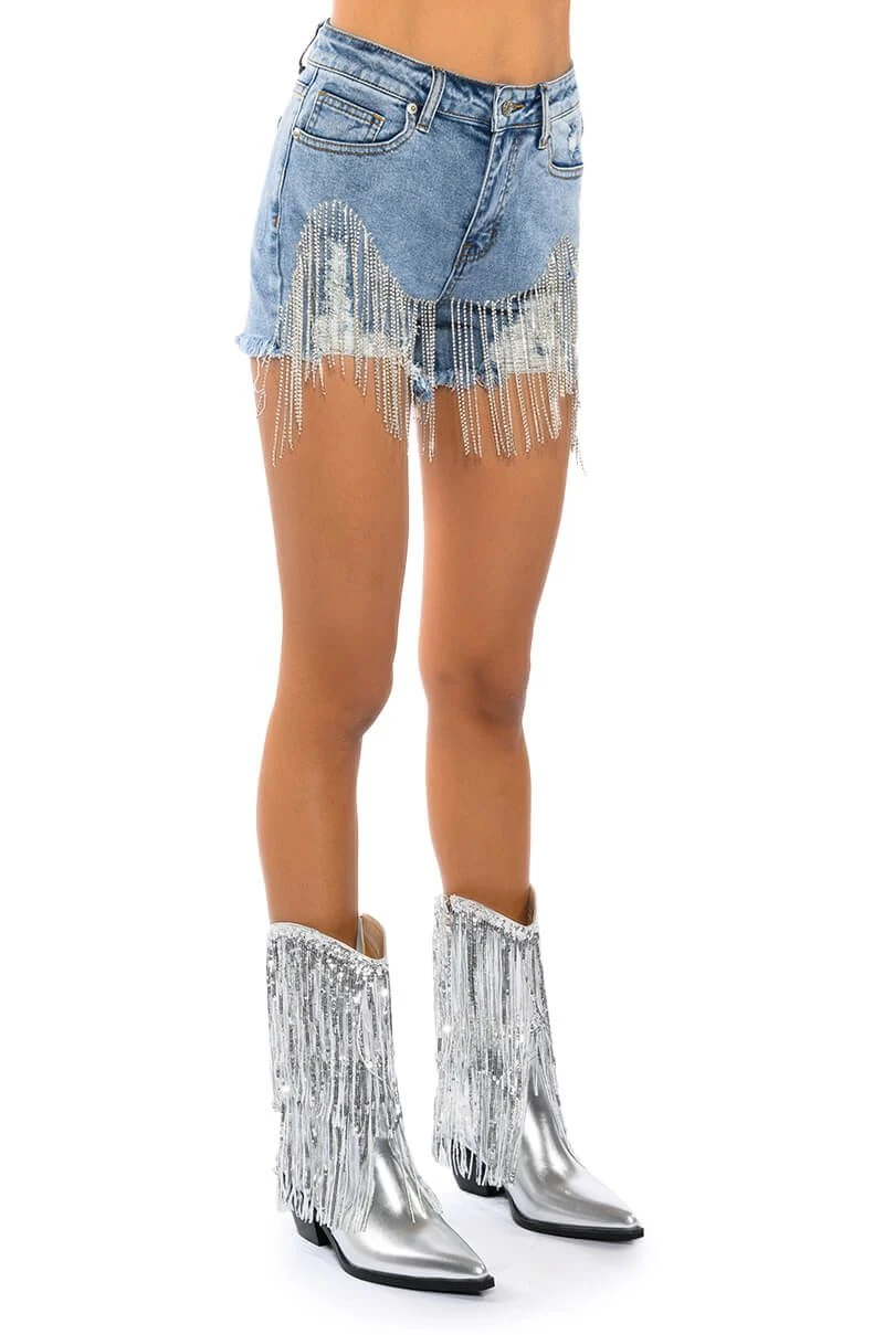 You love it, then come and get it. Time to add The Akira Label Fresh Out The Runway Rhinestone Denim Short to your cart. These slightly stretchy denim shorts feature a high rise waist, four pocket design, belt loops, zipper fly button fastening, slight distressed details, raw hems, and glam rhinestone fringe trimming. Style with a rhinestone bra top for the full bad gal effect.