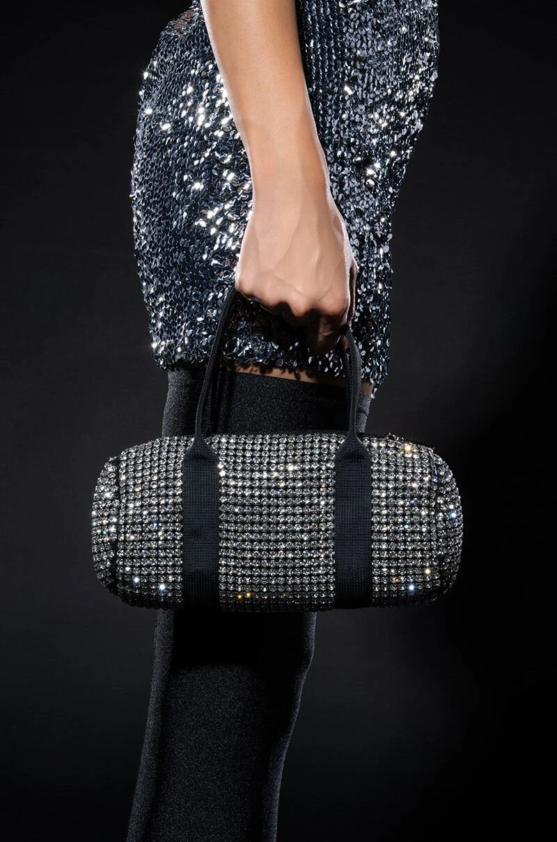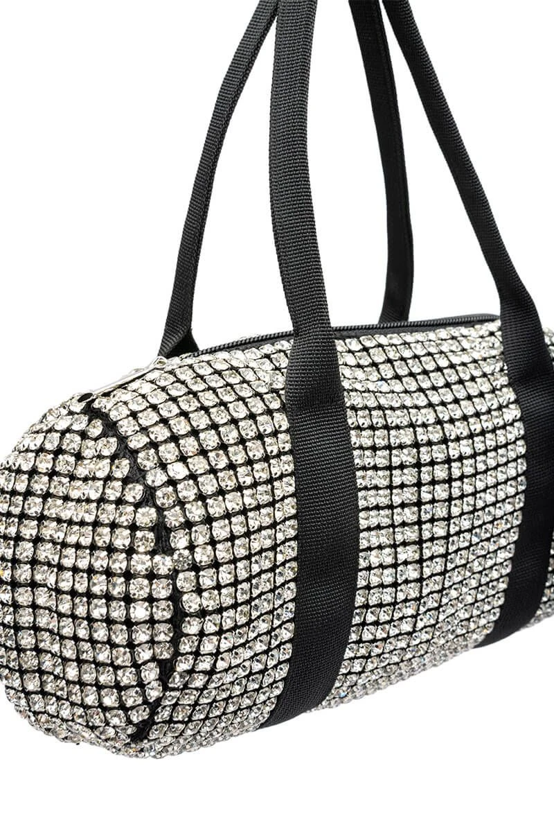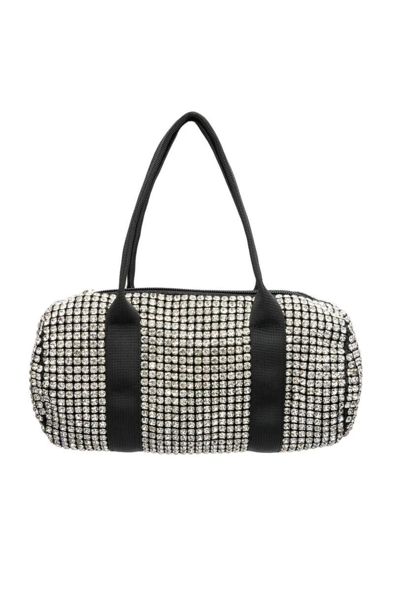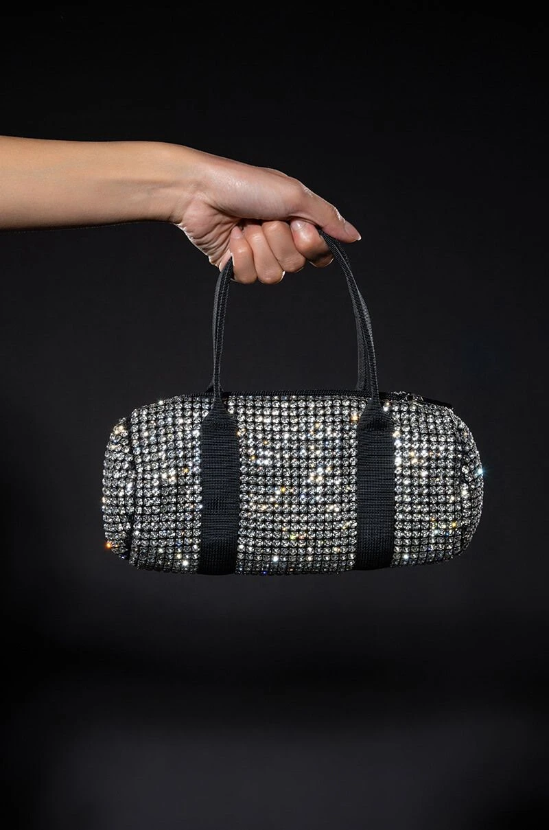 The AKIRA Label FTW Rhinestone Mini Duffle Purse features a netted rhinestone outer layer, dual top handles, a mini duffle bag silhouette, a cylindrical interior compartment, and a top zipper closure.