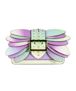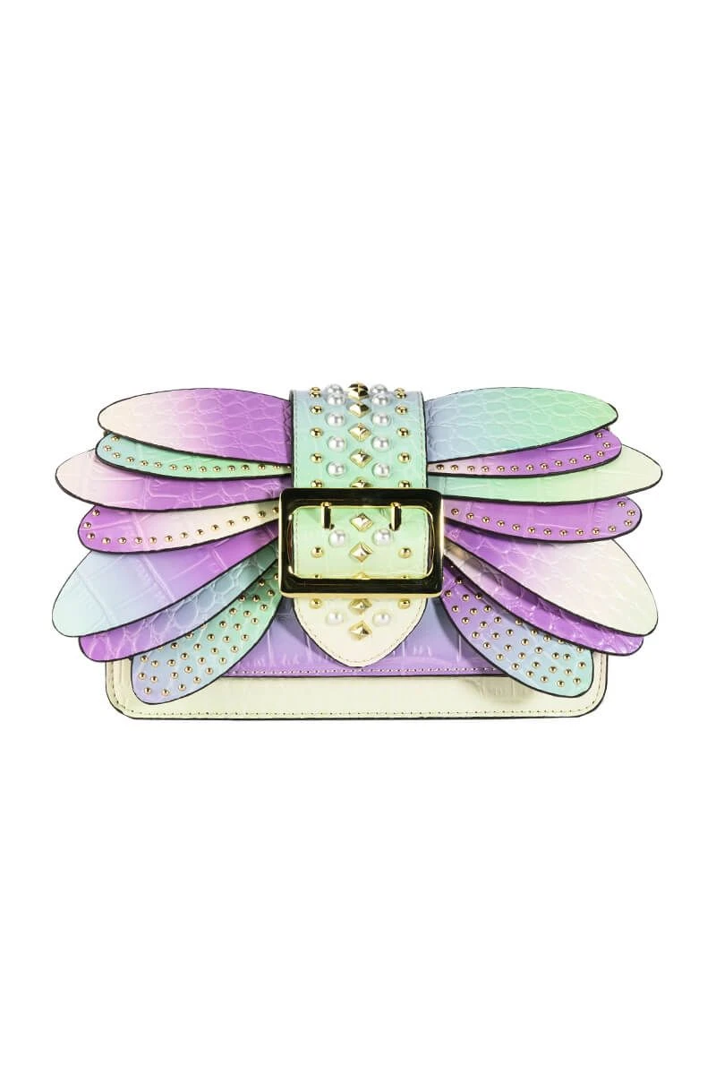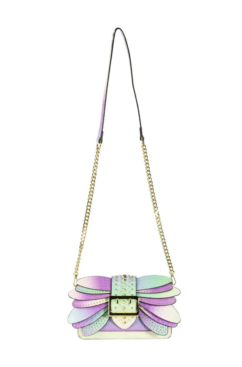 The AKIRA Label Full Bloom Embellished Crossbody Bag is made from a croc embossed faux leather fabrication and features an pastel ombre design, a foldover magnetic snap button closure, a top zipper closure, a front buckle detail, and a detachable faux leather and gold chain shoulder strap. Complete with a layered petal design, golden and pearlescent studded accents, and a zippered inner pouch.