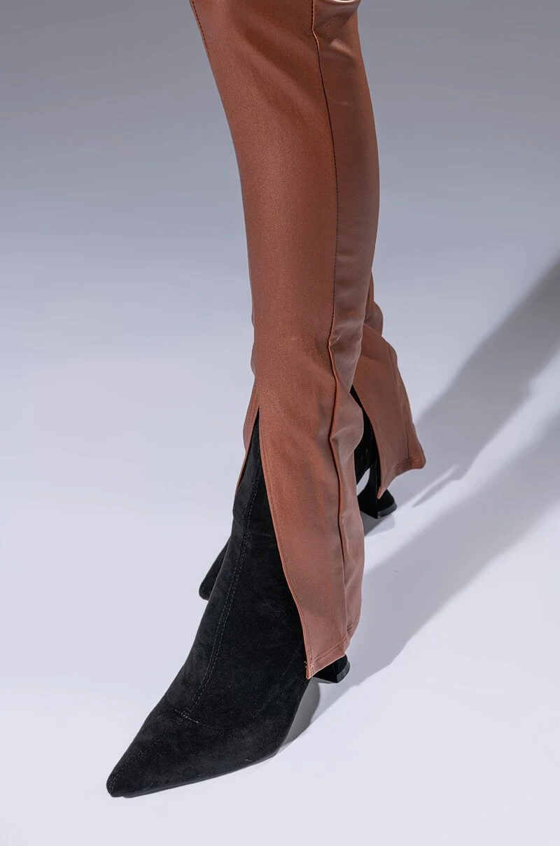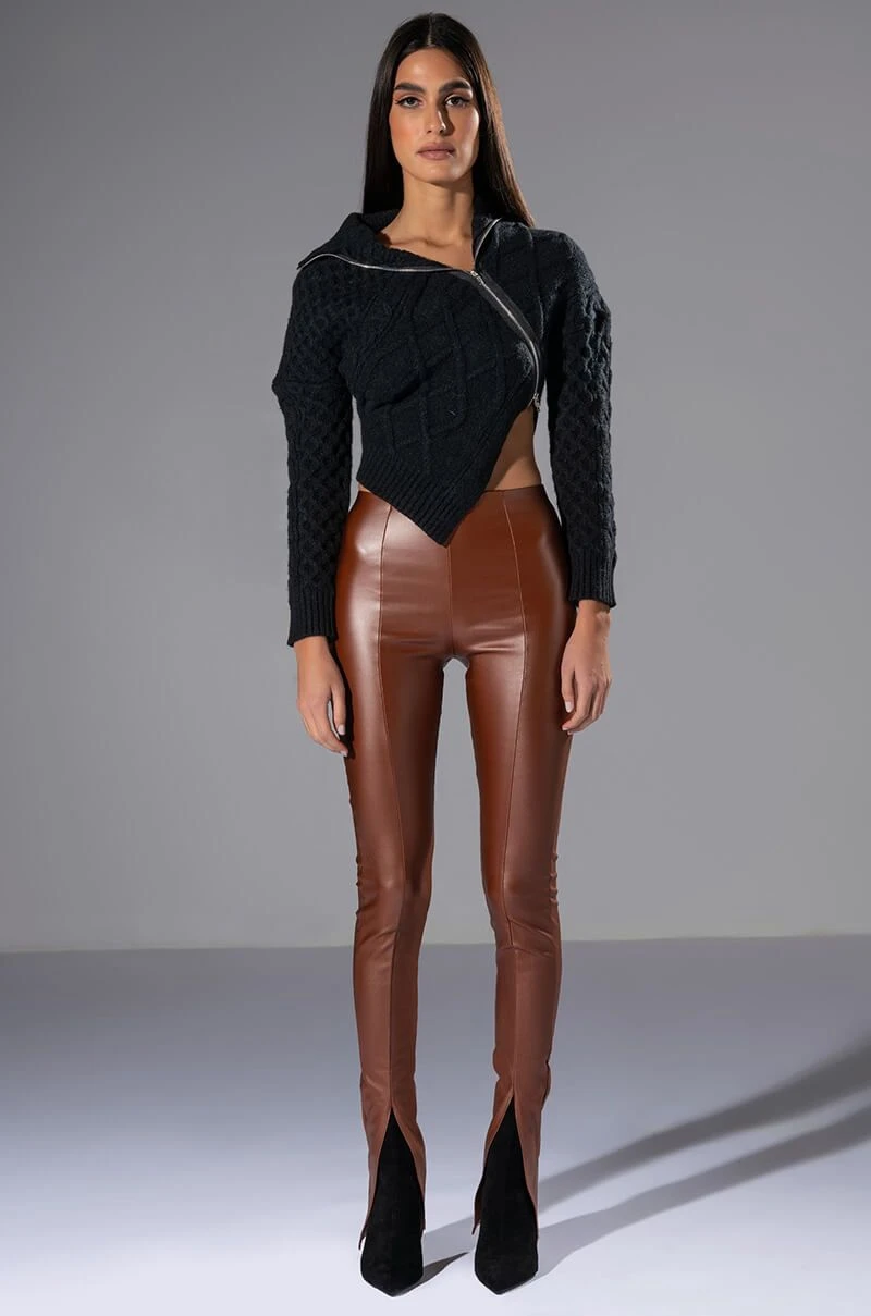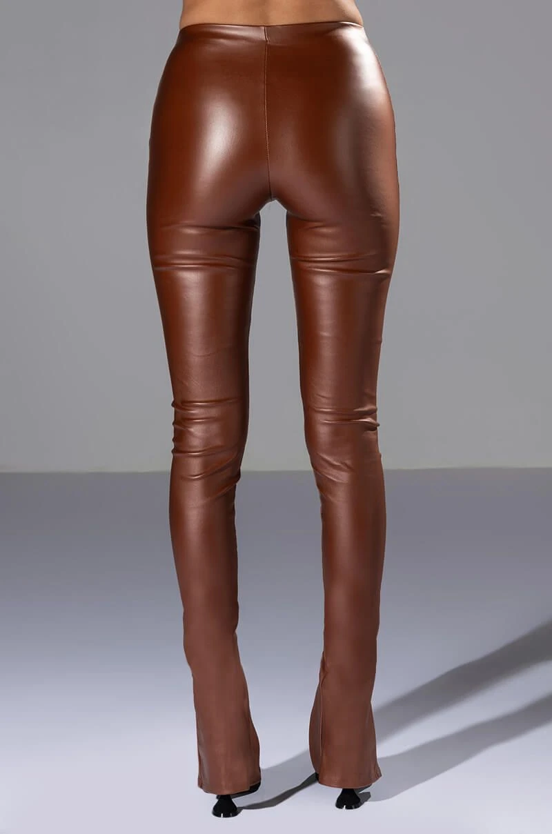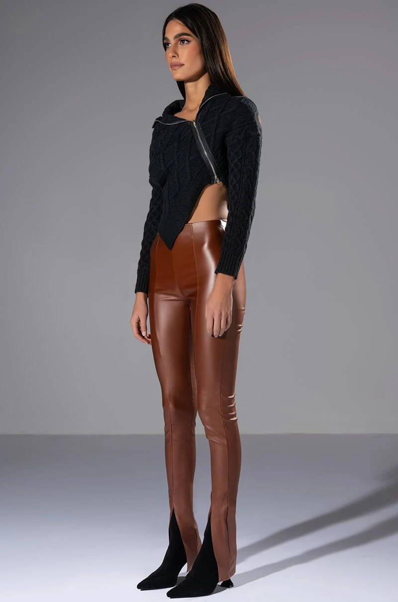Leave a little up to the imagination in the AKIRA Label Full Of Secrets Vegan Leather Trousers. These elasticated faux leather pants are complete with a stretchy waistband, a high rise silhouette, decorative front seams, a bodycon fit, and ankle slits. Style with black flats and a black mock neck crop top to complete the outfit.