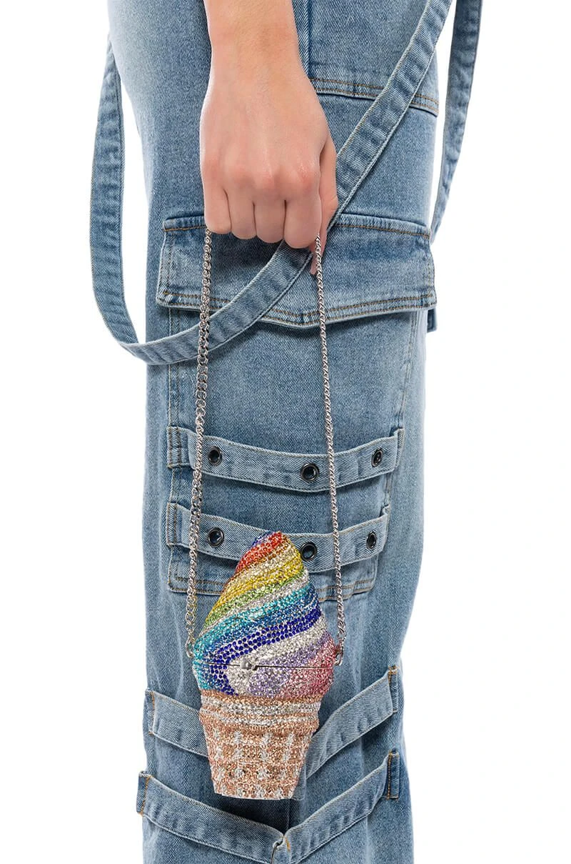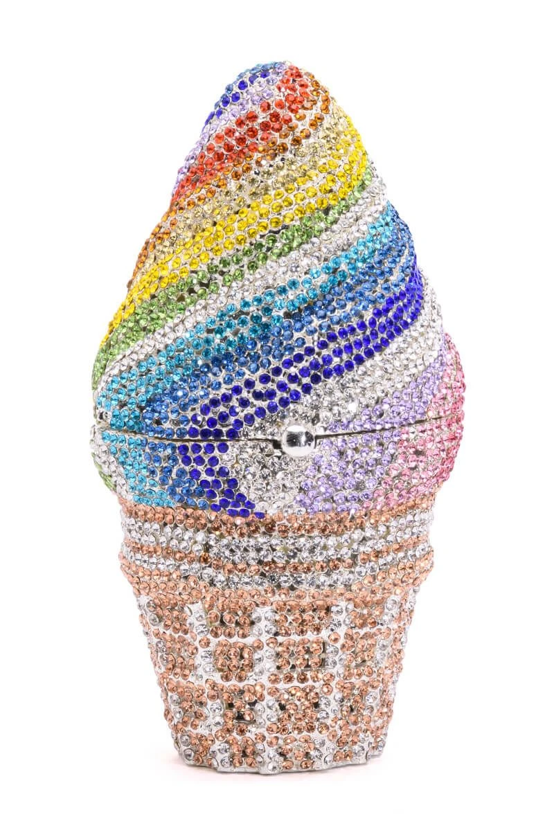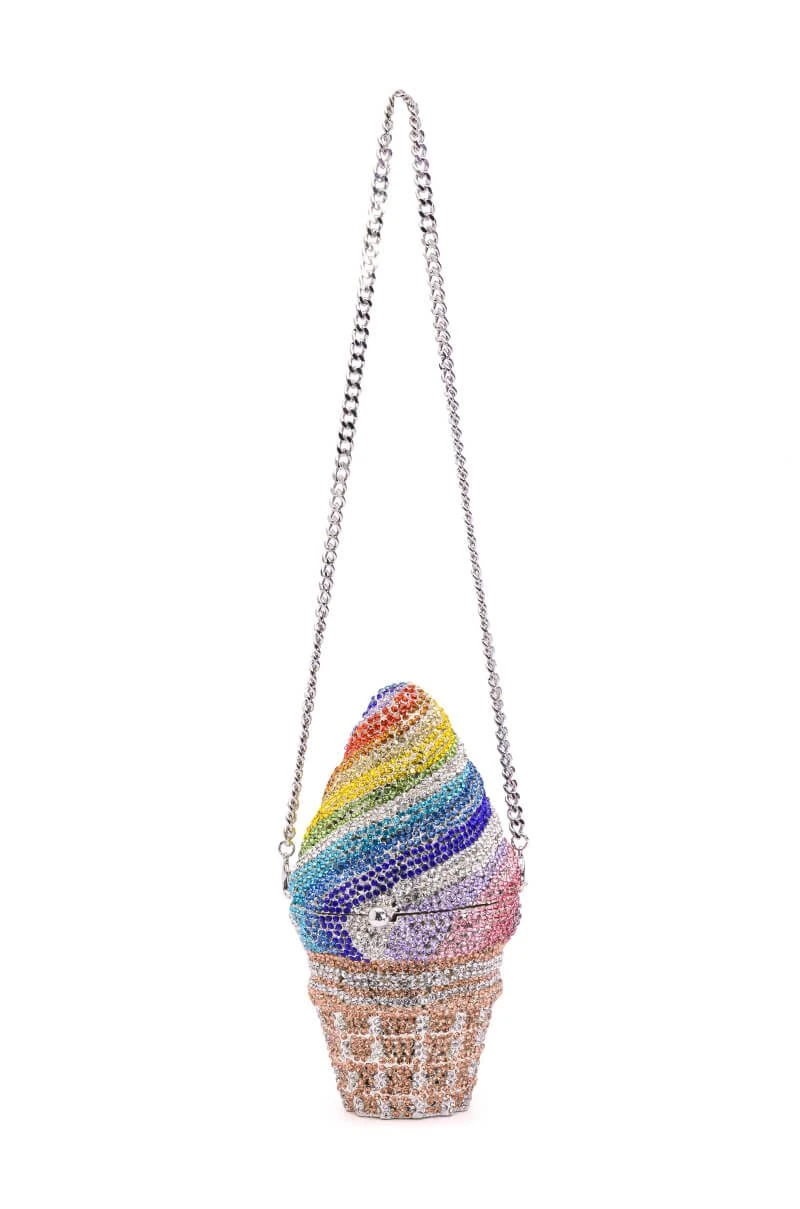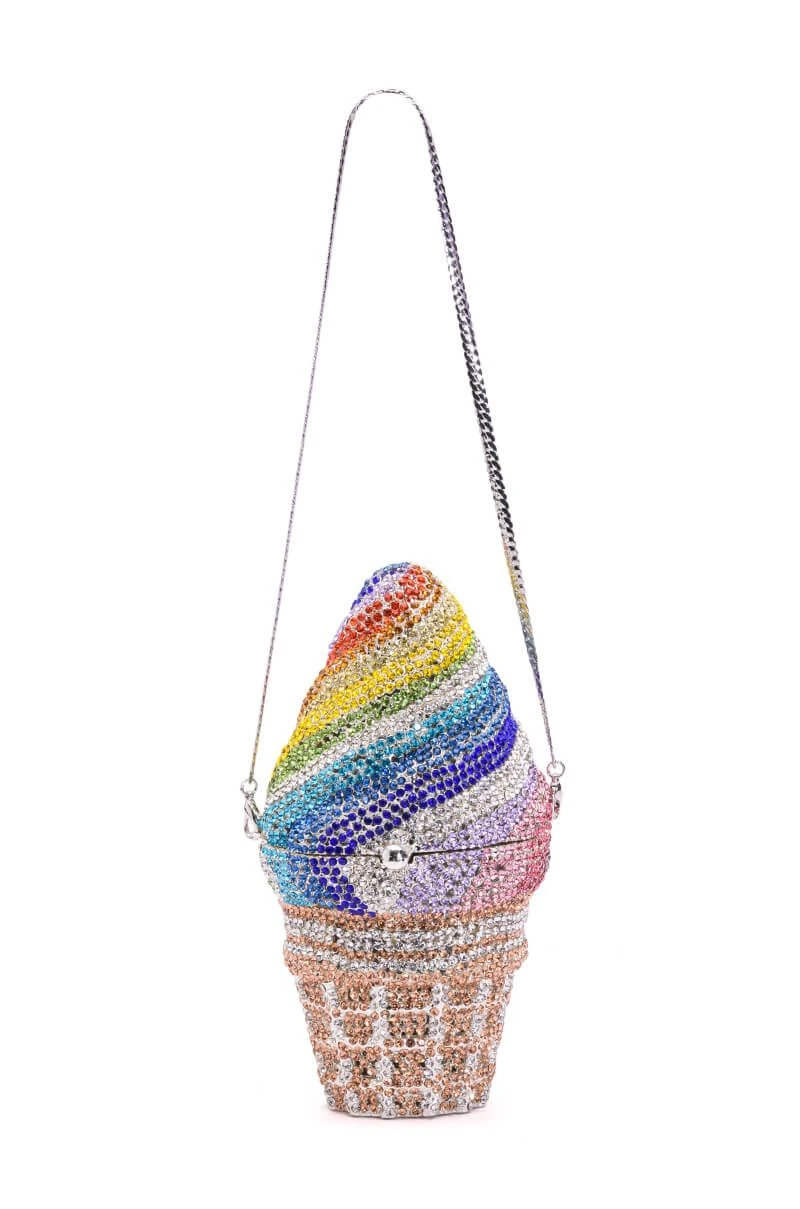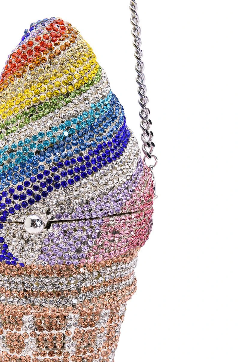 The AKIRA Label Get A Taste Rhinestone Mini Bag is a blinged-out novelty clutch featuring a weighty faux silver metal base, an all-over rhinestone-embellished shell, a rainbow ice cream cone bag-shaped design, an inner pocket with metallic faux leather detail, and two detachable chain link straps. Complete with a magnetic closure.